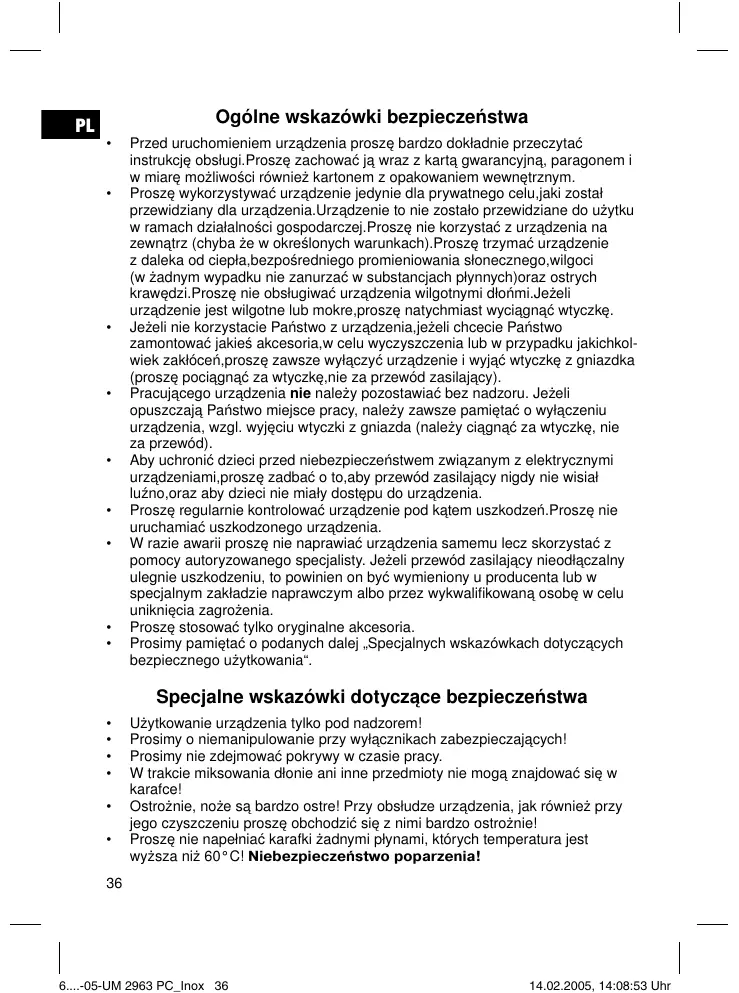 Użytkowanie urządzenia tylko pod nadzorem! Prosimy o niemanipulowanie przy wyłącznikach zabezpieczających! Prosimy nie zdejmować pokrywy w czasie pracy. W trakcie miksowania dłonie ani inne przedmioty nie mogą znajdować się w karafce! Ostrożnie, noże są bardzo ostre! Przy obsłudze urządzenia, jak również przy jego czyszczeniu proszę obchodzić się z nimi bardzo ostrożnie! Proszę nie napełniać karafki żadnymi płynami, których temperatura jest wyższa niż 60°C! Niebezpieczeństwo poparzenia!
