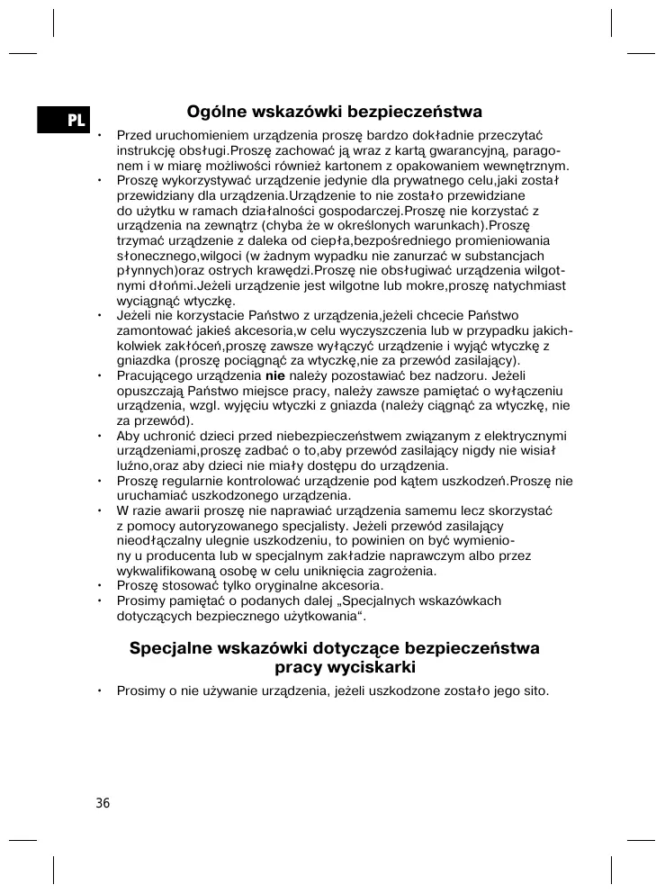 Specjalne wskazówki dotyczne bezpiecznychstwa pracy wyciskarki