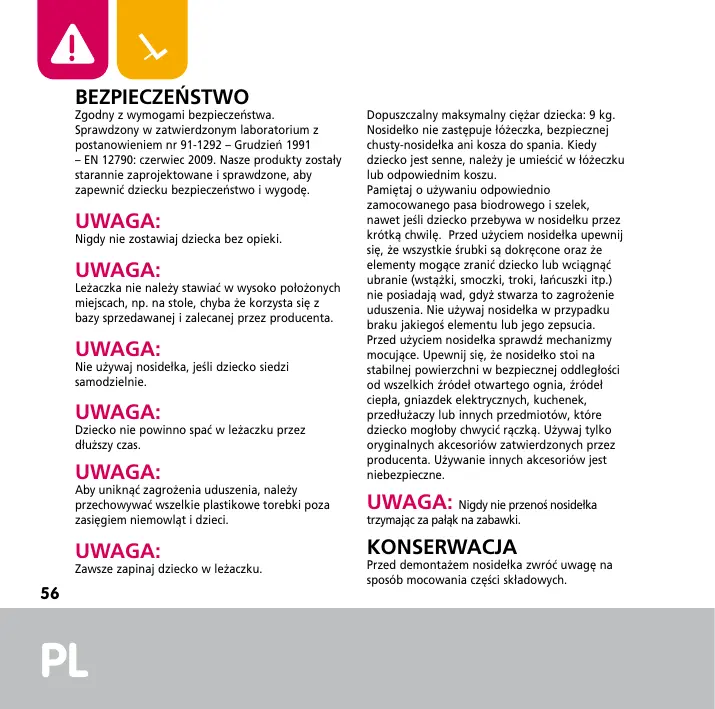BEZPIECZEŃSTWO Zgodny z wymogami bezpieczeństwa. Sprawdzony w zatwierdzonym laboratorium z postanowieniem nr 91-1292 – Grudzień 1991 – EN 12790: czerwiec 2009. Nasze produkty zostały starannie zaprojektowane i sprawdzone, aby zapewnić dziecku bezpieczeństwo i wygodę. UWAGA: Nigdy nie zostawiaj dziecka bez opieki. UWAGA: Leżaczka nie należy stawiać w wysoko położonych miejscach, np. na stole, chyba że korzysta się z bazy sprzedawanej i zalecanej przez producenta. UWAGA: Nie używaj nosidełka, jeśli dziecko siedzi samodzielnie. UWAGA: Dziecko nie powinno spać w leżaczku przez dłuższy czas. UWAGA: Dopuszczalny maksymalny ciężar dziecka: 9 kg. Nosidełko nie zastępuje łóżeczka, bezpiecznej chusty-nosidełka ani kosza do spania. Kiedy dziecko jest senne, należy je umieścić w łóżeczku lub odpowiednim koszu. Pamiętaj o używaniu odpowiednio zamocowanego pasa biodrowego i szelek, nawet jeśli dziecko przebywa w nosidełku przez krótką chwilę. Przed użyciem nosidełka upewnij się, że wszystkie śrubki są dokręcone oraz że elementy mogące zranić dziecko lub wciągnąć ubranie (wstążki, smoczki, troki, łańcuszki itp.) nie posiadają wad, gdyż stwarza to zagrożenie uduszenia. Nie używaj nosidełka w przypadku braku jakiegoś elementu lub jego zepsucia. Przed użyciem nosidełka sprawdź mechanizmy mocujące. Upewnij się, że nosidełko stoi na stabilnej powierzchni w bezpiecznej oddległości od wszelkich źródeł otwartego ognia, źródeł ciepła, gniazdek elektrycznych, kuchenek, przedłużaczy lub innych przedmiotów, które dziecko mogłoby chwycić rączką. Używaj tylko oryginalnych akcesoriów zatwierdzonych przez producenta. Używanie innych akcesoriów jest niebezpieczne. Aby uniknąć zagrożenia uduszenia, należy przechowywać wszelkie plastikowe torebki poza zasięgiem niemowląt i dzieci. UWAGA: Nigdy nie przenoś nosidełka UWAGA: KONSERWACJA Zawsze zapinaj dziecko w leżaczku.