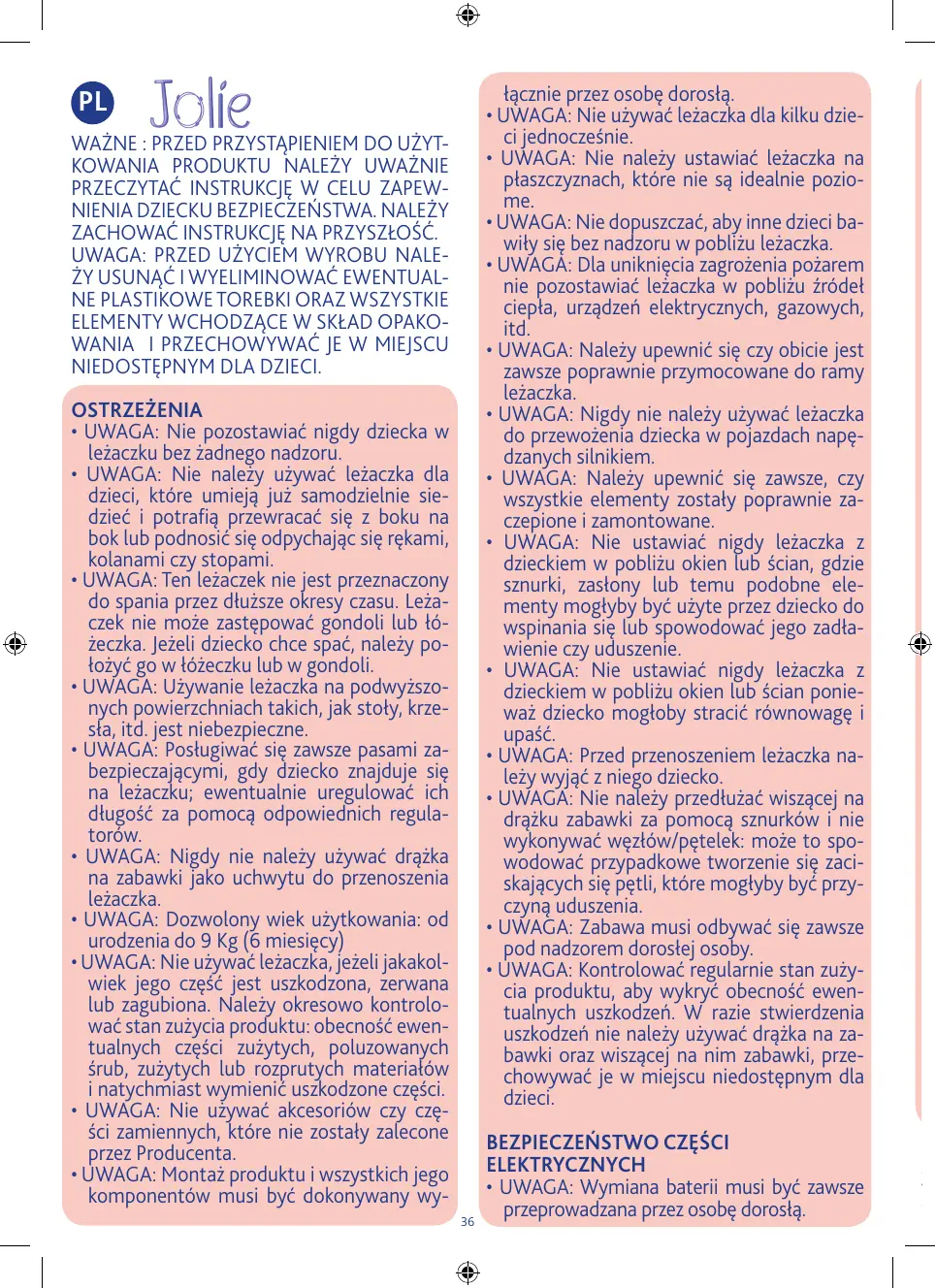 - UWAGA: Nie dopuszczać, aby inne dzieci bawiły się bez nadzoru w pobliżu leżaczka.