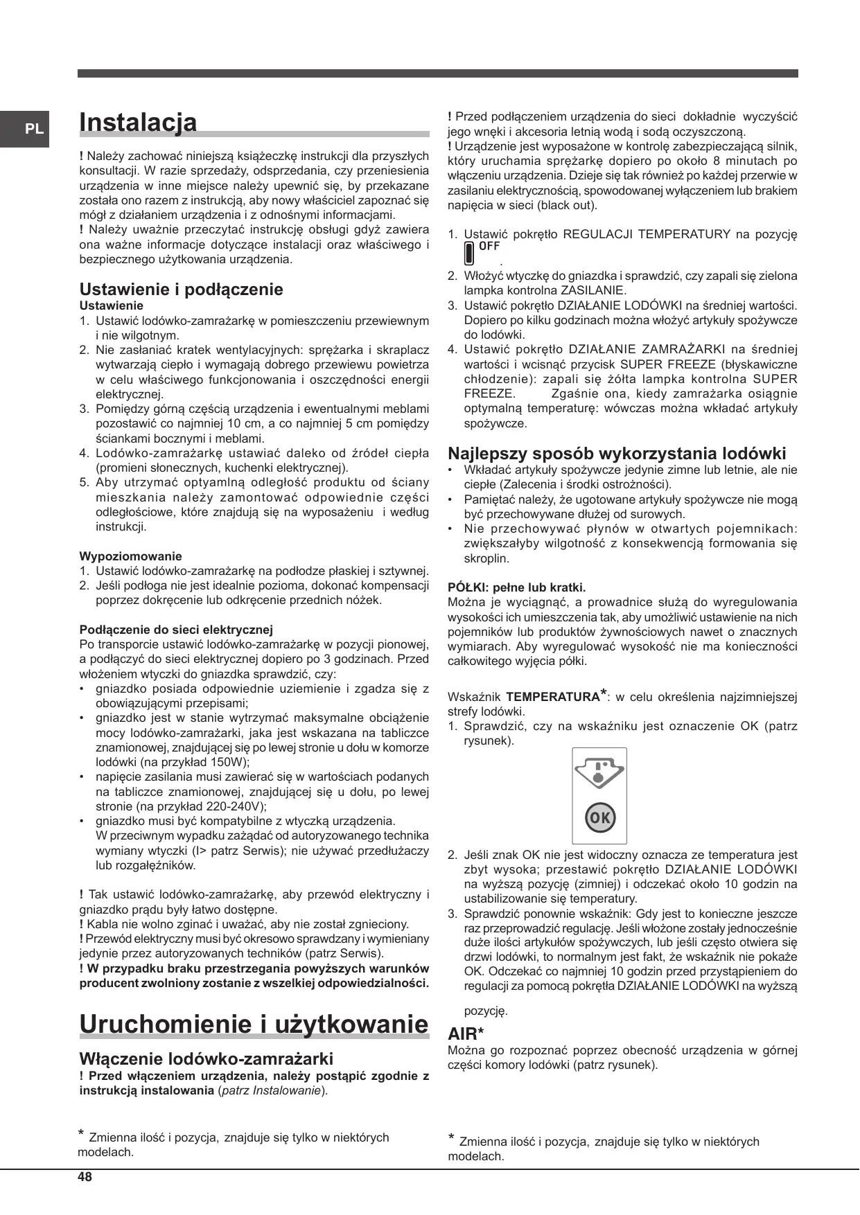 raz przeprowadzić regulację. Jeśli włożone zostały jednocześnie duże ilości artykułów spożywczych, lub jeśli często otwiera się drzwi lodówki, to normalnym jest fakt, że wskaźnik nie pokaże OK. Odczekać co najmniej 10 godzin przed przystąpieniem do regulacji za pomocą pokrętła DZIAŁANIE LODÓWKI na wyższą pozycję. AIR* Włączenie lodówko-zamrażarki Można go rozpoznać poprzez obecność urządzenia w górnej części komory lodówki (patrz rysunek).