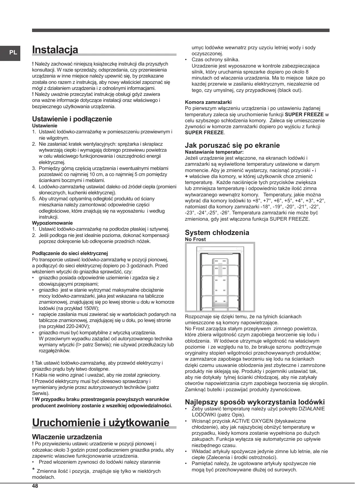 - Lodówko-zamrażarka jest wyposzażona w zabezmieczenie silnika (patrz Uruchomienie i uzytkOWanie).