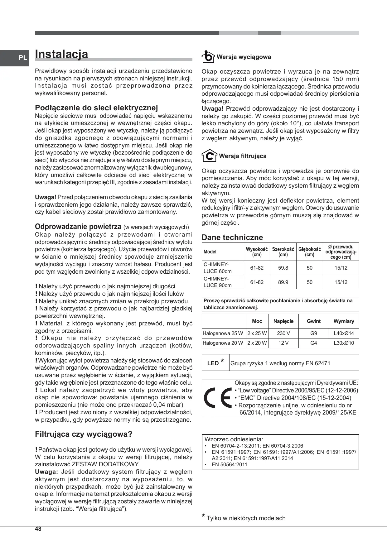 Uwaga: Jesli dodatkowy system filtrujacy z weglem aktywnym jest dostarczany na wyposazeniu, to, w niektérych przypadkach, moze byé juZ zainstalowany w okapie. Informacje na temat przeksztalicenia okapu z wersji wyciagowej w wersje filtrujaca zostaly zawarte w niniejszej instrukcji (zob. “Wersja filtrujaca”).