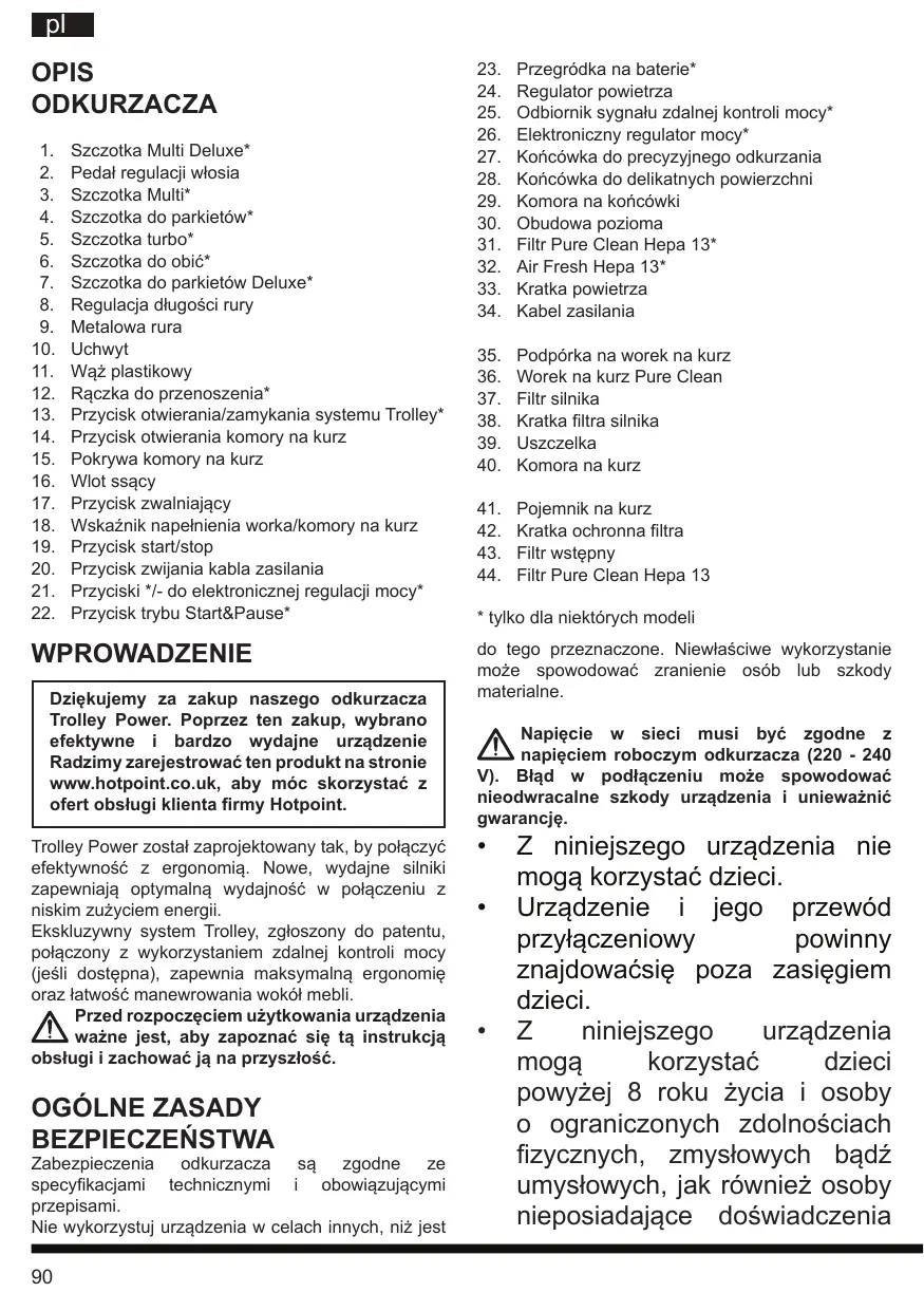 Szczotka Multi Deluxe* Pedał regulacji włosia Szczotka Multi* Szczotka do parkietów* Szczotka turbo* Szczotka do obić* Szczotka do parkietów Deluxe* Regulacja długości rury Metalowa rura Uchwyt Wąż plastikowy Rączka do przenoszenia* Przycisk otwierania/zamykania systemu Trolley* Przycisk otwierania komory na kurz Pokrywa komory na kurz Wlot ssący Przycisk zwalniający Wskaźnik napełnienia worka/komory na kurz Przycisk start/stop Przycisk zwijania kabla zasilania Przyciski */- do elektronicznej regulacji mocy* Przycisk trybu Start&Pause* WPROWADZENIE Dziękujemy za zakup naszego odkurzacza Trolley Power. Poprzez ten zakup, wybrano efektywne i bardzo wydajne urządzenie Radzimy zarejestrować ten produkt na stronie www.hotpoint.co.uk, aby móc skorzystać z ofert obsługi klienta firmy Hotpoint. Trolley Power został zaprojektowany tak, by połączyć efektywność z ergonomią. Nowe, wydajne silniki zapewniają optymalną wydajność w połączeniu z niskim zużyciem energii. Ekskluzywny system Trolley, zgłoszony do patentu, połączony z wykorzystaniem zdalnej kontroli mocy (jeśli dostępna), zapewnia maksymalną ergonomię oraz łatwość manewrowania wokół mebli. Przed rozpoczęciem użytkowania urządzenia ważne jest, aby zapoznać się tą instrukcją obsługi i zachować ją na przyszłość.