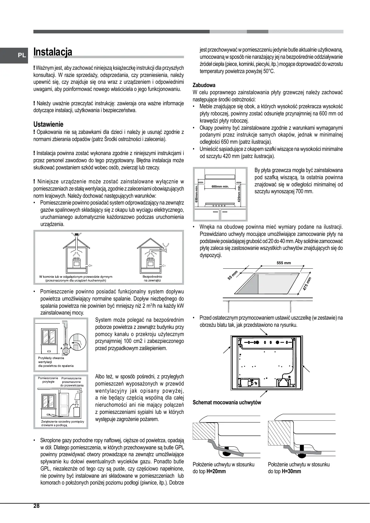 - Pomieszczenie powinno posiadać system odprowadzający na zewnątrz gazów spalinowych składający się z okapu lub wyciągu elektrycznego, uruchamianego automatycznie każdorazowo podczas uruchomienia urządzenia. Zabudowa W celu poprawnego zainstalowania płyty grzewczej należy zachować następujące środki ostrożności:
