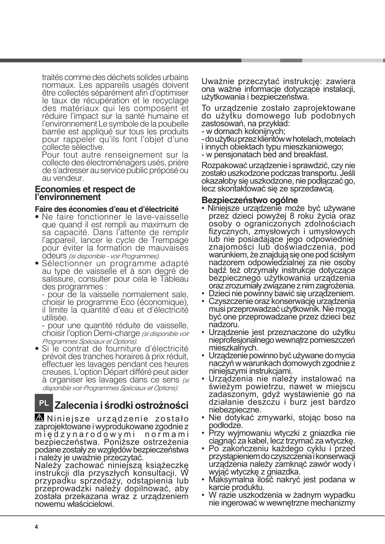 Le nettoyage et l'entretien de l'appareil doivent être effectués par l'utilisateur. Ils ne doivent pas être effectués par des enfants sans surveillance. Cet appareil est conçu pour un usage de type non professionnel à l'intérieur d'une habitation. Cet appareil est destiné au lavage de vaisselle à usage domestique et selon les instructions reportées dans cette notice. Ne pas installer l’appareil à l’extérieur, même dans un endroit protégé, car il est extrêmement dangereux de l’exposer à la pluie et aux orages. Ne pas toucher au lave-vaisselle pieds nus. Ne jamais tirer sur le câble pour débrancher la fiche de la prise de courant. Fermer le robinet de l’eau et débrancher la fiche de la prise de courant après chaque utilisation et avant d’effectuer tous travaux de nettoyage et d’entretien. Le nombre maximal de couverts est indiqué dans la fiche produit. En cas de panne, éviter à tout prix d’accéder aux mécanismes internes pour tenter une réparation. Ne pas s’appuyer à la porte ouverte ou s’y asseoir : l’appareil pourrait basculer. Ne pas garder la porte ouverte pour éviter de buter contre elle en risquant de se faire mal. Garder les produits de lavage et de rinçage hors de la portée des enfants. Les emballages ne sont pas des jouets pour enfants. Les couteaux et ustensiles de cuisine à bords tranchants doivent être disposés, pointes et lames tournées vers le bas, dans le panier à couverts ou, à plat, sur les clayettes rabattables du panier supérieur ou bien encore, si le modèle en est équipé, dans le plateau ou troisième panier.