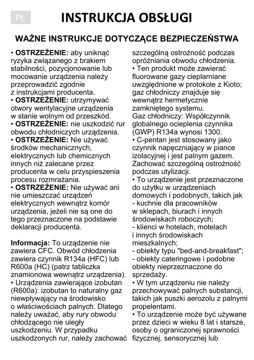 + OSTRZEZENIE: aby uniknaé ryzyka zwigzanego z brakiem stabilno$ci, pozycjonowanie lub mocowanie urzadzenia nalezy przeprowadzié zgodnie z instrukcjami producenta. + OSTRZEZENIE: utrzymywaé otwory wentylacyjne urzadzenia w stanie wolnym od przeszkéd. + OSTRZEZENIE: nie uszkodzié rur obwodu chtodniczych urzadzenia. + OSTRZEZENIE: Nie uzywaé $rodkéw mechanicznych, elektrycznych lub chemicznych innych niz zalecane przez producenta w celu przyspieszenia procesu rozmrazania. + OSTRZEZENIE: Nie uzywaé ani nie umieszczaé urzadzeñ elektrycznych wewnatrz komér urzadzenia, jezeli nie sa one do tego przeznaczone na podstawie deklaracji producenta. Informacja: To urzadzenie nie zawiera CFC. Obwéd chtodzenia zawiera czynnik R134a (HFC) lub R600a (HC) (patrz tabliczka znamionowa wewnatrz urzadzenia). + Urzadzenia zawierajace izobutan (R600a): izobutan to naturalny gaz niewptywajacy na $rodowisko o wla$ciwo$ciach palnych. Dlatego nalezy uwazaé, aby rury obwodu chtodzacego nie ulegty uszkodzeniu. W przypadku uszkodzonych rur, nalezy zachowaé szczegôina ostrozno$é podczas oprézniania obwodu chtodzenia. - Ten produkt moze zawieraé fluorowane gazy cieplarniane uwzglednione w protokole z Kioto; gaz chlodniczy znajduje sie wewnatrz hermetycznie zamknietego systemu. Gaz chlodniczy: Wspétczynnik globalnego ocieplenia czynnika (GWP) R134a wynosi 1300. + C-pentan jest stosowany jako czynnik napeczniajacy w piance izolacyjne) i jest palnym gazem. Zachowaé szczegélna ostrozno$é podczas utylizacii. - To urzadzenie jest przeznaczone do uzytku w urzadzeniach domowych i podobnych, takich jak - kuchnie dla pracownikéw w sklepach, biurach i innych $rodowiskach roboczych; - klienci w hotelach, motelach ï innych $rodowiskach mieszkalnych:; - obiekty typu "bed-and-breakfast"; - obiekty cateringowe i podobne obiekty nieprzeznaczone do sprzedazy.