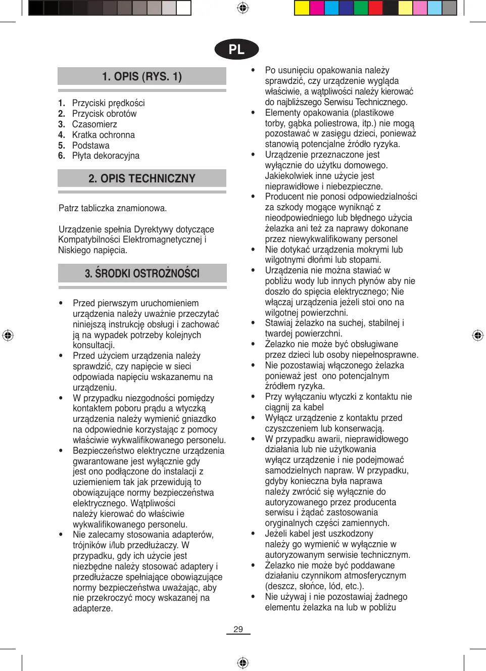Po usunięciu opakowania należy sprawdzić, czy urządzenie wygląda właściwie, a wątpliwości należy kierować do najbliższego Serwisu Technicznego. Elementy opakowania (plastikowe torby, gąbka poliestrowa, itp.) nie mogą pozostawać w zasięgu dzieci, ponieważ stanowią potencjalne źródło ryzyka. Urządzenie przeznaczone jest wyłącznie do użytku domowego. Jakiekolwiek inne użycie jest nieprawidłowe i niebezpieczne. Producent nie ponosi odpowiedzialności za szkody mogące wyniknąć z nieodpowiedniego lub błędnego użycia żelazka ani też za naprawy dokonane przez niewykwalifikowany personel Nie dotykać urządzenia mokrymi lub wilgotnymi dłońmi lub stopami. Urządzenia nie można stawiać w pobliżu wody lub innych płynów aby nie doszło do spięcia elektrycznego; Nie włączaj urządzenia jeżeli stoi ono na wilgotnej powierzchni. Stawiaj żelazko na suchej, stabilnej i twardej powierzchni. Żelazko nie może być obsługiwane przez dzieci lub osoby niepełnosprawne. Nie pozostawiaj włączonego żelazka ponieważ jest ono potencjalnym źródłem ryzyka. Przy wyłączaniu wtyczki z kontaktu nie ciągnij za kabel Wyłącz urządzenie z kontaktu przed czyszczeniem lub konserwacją. W przypadku awarii, nieprawidłowego działania lub nie użytkowania wyłącz urządzenie i nie podejmować samodzielnych napraw. W przypadku, gdyby konieczna była naprawa należy zwrócić się wyłącznie do autoryzowanego przez producenta serwisu i żądać zastosowania oryginalnych części zamiennych. Jeżeli kabel jest uszkodzony należy go wymienić w wyłącznie w autoryzowanym serwisie technicznym. Żelazko nie może być poddawane działaniu czynnikom atmosferycznym (deszcz, słońce, lód, etc.). Nie używaj i nie pozostawiaj żadnego elementu żelazka na lub w pobliżu