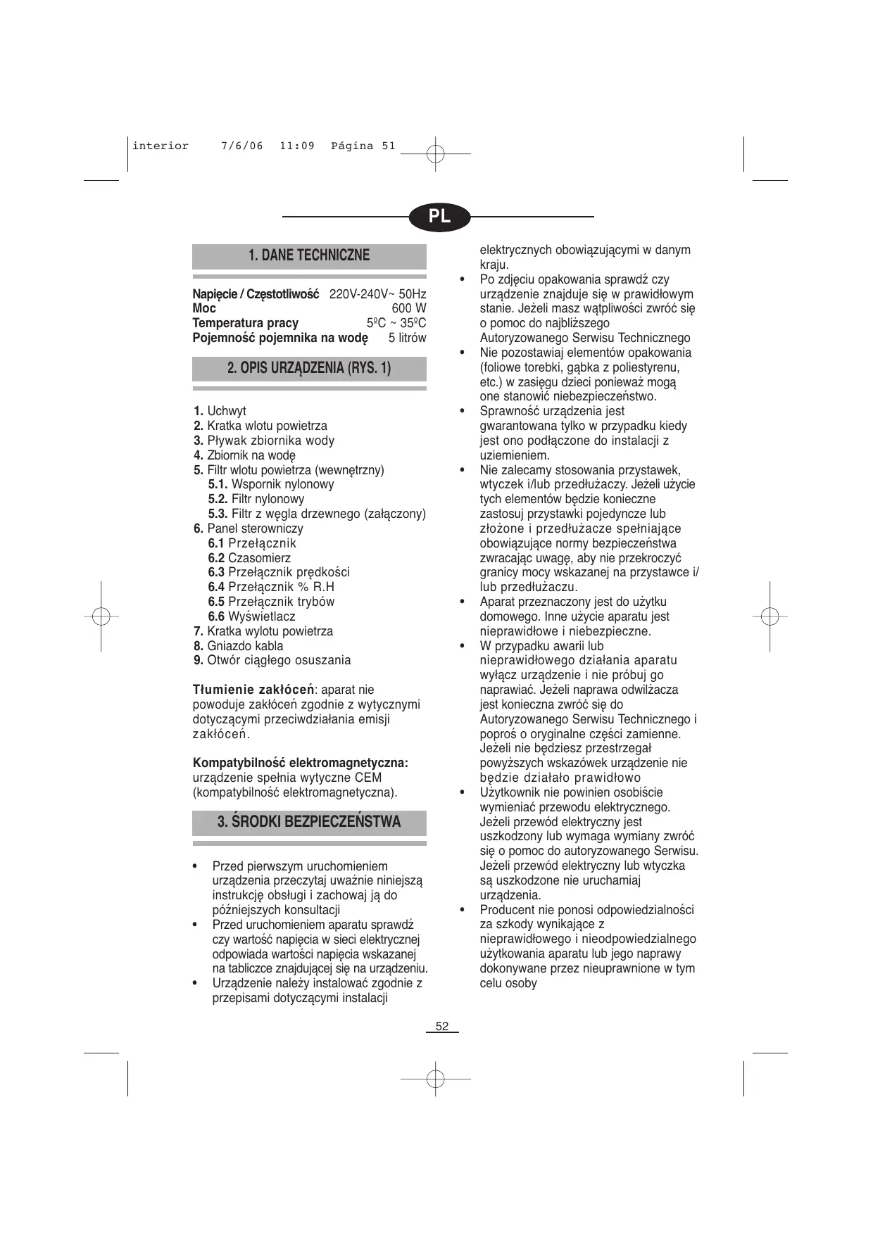 Filtro de entrada de ar (interno) 5.1. Suporte de Nylon 5.2. Filtro de Nylon 5.3. Filtro de carvão vegetal (incluído) Painel de comandos 6.1. Interruptor 6.2. Temporizador 6.3. Selector de velocidade 6.4. Selector % R.H. 6.5. Selector de função 6.6. Visor Grelha de saída de ar Alojamento para cabo Orifício de drenagem contínua