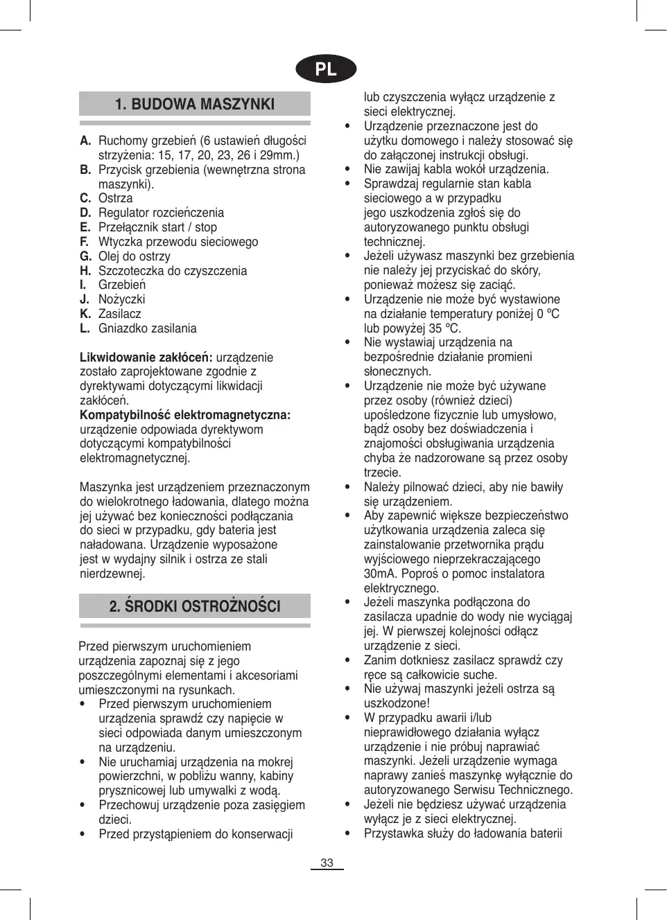 • Vérifiez périodiquement l’état du cordon. S’il est endommagé, adressezvous à un Service Technique agréé. Si vous utilisez la tondeuse sans le peigne, ne la frottez pas sur la peau, pour éviter de vous couper. Ne pas exposer l’appareil à une température inférieure à 0º C, ni supérieure à 35º C. Veillez à le garder toujours à l’abri des rayons directs du soleil. Cet appareil n’est pas destiné à être utilisé par des personnes (enfants y compris) souffrant d’un handicap physique, sensoriel ou mental, ni celles manquant d’expérience ou ignorant son fonctionnement, sauf si des instructions appropriées leur ont été données et sous la surveillance d’une personne responsable de leur sécurité. Ne laissez pas jouer les enfants avec l’appareil. Pour une plus grande protection, il est recommandé d’installer un disjoncteur différentiel à courant résiduel à haute sensibilité (RCD) de 30mA. Consultez votre installateur. Si la tondeuse en marche venait à se mouiller, ne tentez pas de la sécher. Débranchez aussitôt l’appareil de la prise de courant. Ne jamais toucher l’adaptateur avec les mains mouillées. Ne jamais utiliser la tondeuse si les lames de coupe sont endommagées. En cas de panne ou de défaillance de fonctionnement débranchez l’appareil et n’essayez pas de le réparer vousmême. Adressez-vous toujours, pour le réparer, à un Service d’Assistance Technique agréé par le fabriquant. Débranchez l’appareil lorsque vous ne l’utilisez pas. L’adaptateur de la tondeuse à cheveux sert à recharger la batterie de l’appareil. Vous pouvez vous coupez les cheveux