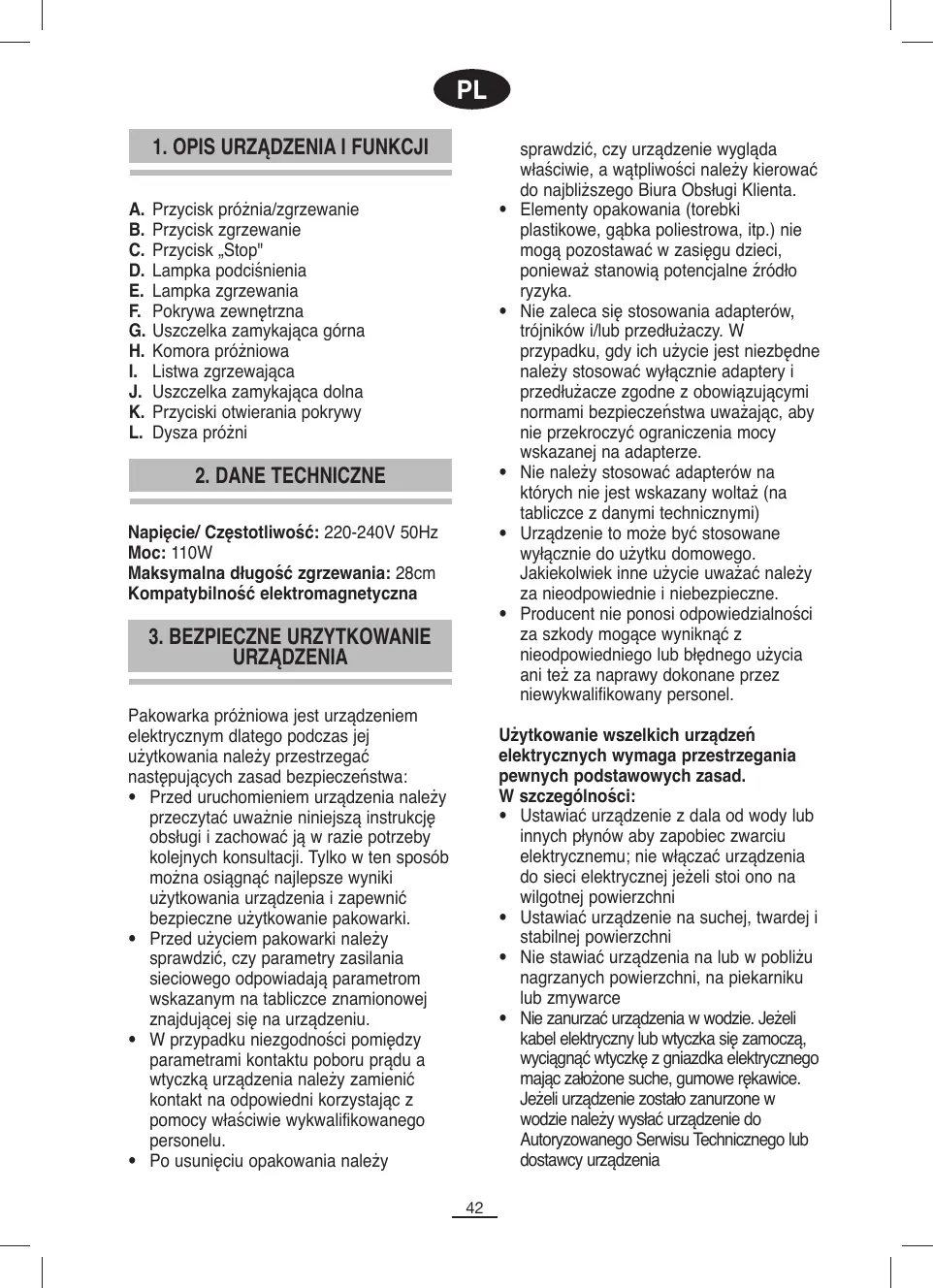 • Aby uniknąć poparzeń podczas użytkowanie urządzenia nie dotykać listwy zgrzewającej • Nie dopuszczać by kabel dotykał gorących powierzchni i ostrych krawędzi • Wyłączając urządzenie nie pociągać za kabel elektryczny • Wyłączyć urządzenie z kontaktu kiedy urządzenie nie jest używane i przed wykonaniem jakiejkolwiek operacji konserwacyjnej • W przypadku awarii i/lub złego funkcjonowania wyłączyć urządzenie i nie podejmować samodzielnych napraw. W przypadku, gdy konieczna jest naprawa należy zwrócić się wyłącznie do autoryzowanego przez producenta Serwisu Technicznego i żądać zastosowania oryginalnych części zamiennych. W razie nieprzestrzegania powyższych wskazówek, urządzenie może ulec uszkodzeniu. • Do mycia urządzenia nie stosować silnie działających detergentów; używać delikatnych ściereczek • Urządzenie nie jest przeznaczone do użytkowania przez dzieci; nie dopuszczać dzieci do użytkowania urządzenia • Aby zapewnić dobre efekty działania urządzenia używać torebek i akcesoriów zalecanych przez producenta • Użytkownik nie może wymieniać kabla. W przypadku, gdy jest on uszkodzony lub wymaga wymiany, należy zwrócić się wyłącznie do autoryzowanego przez producenta Serwisu. Nie włączać urządzenia kiedy kabel lub wtyczka są uszkodzone • Kiedy zdecydują się Państwo na ostateczne pozbycie urządzenia, wskazane jest wyłączenie urządzenia z kontaktu i przecięcie kabla zasilającego.