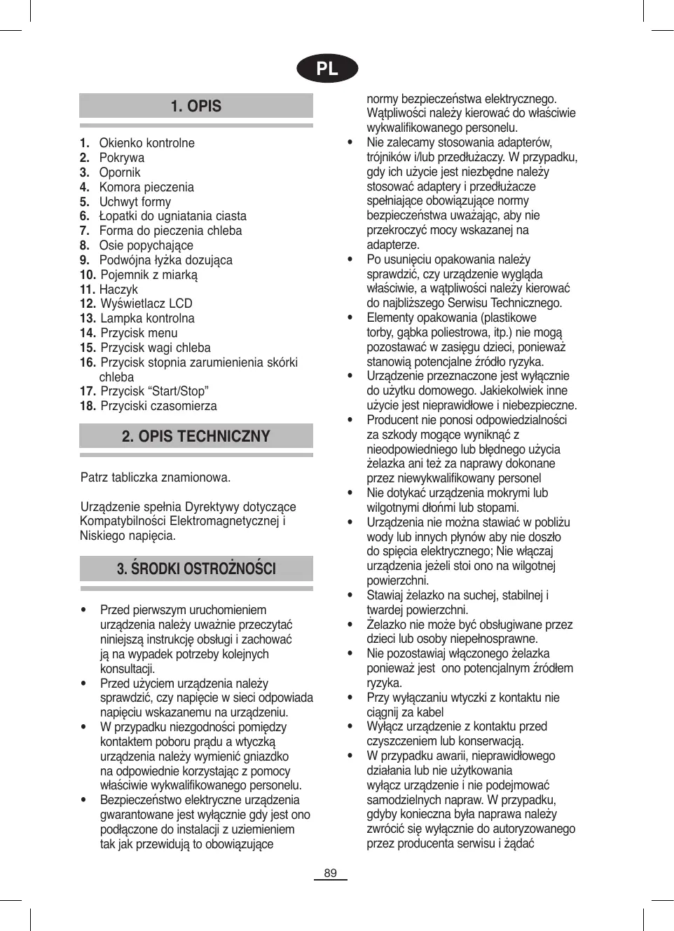 zastosowania oryginalnych czeéci zamiennych. Jezeli kabel jest uszkodzony nale2y go wymienié w wylacznie w autoryzowanym serwisie technicznym. Zelazko nie moze byé poddawane dziataniu czynnikom atmosferycznym (deszcz, stoñce, lôd, etc.). Urzadzenie nie jest przeznaczone do obstugi przez dzieci i osoby z zaburzeniami sprawno$ci fizycznei, zmystôw, zdolno$ci umystowych, oraz przez osoby bez odpowiedniego do$wiadczenia lub wiedzy; z Wyjatkiem obslugi pod nadzorem opiekuna prawnego, po otrzymaniu przeszkolenia w zakresie obstugi urzadzenia. Uwazaé na dzieci — urzadzenie nie jest przeznaczone do zabawy. Zaleca sie zabezpieczenie urzadzenia wylacznikiem réznicowopradowym (RCD) Z pradem znamionowym réZnicowym nie wyzszym od 30 mA. Aby uzyskaé wiecej informacji, nalezy skontaktowaé sie z elektrykiem. Nie uzywaj i nie pozostawiaj Zadnego elementu Zelazka na lub w poblizu rozgrzanych powierzchni (plyty gazowe, elektryczne lub piekarniki). Do mycia Zelazka nie uzywaj ptynôw lub szorstkich $ciereczek. Nie dotykaj rozgrzanych powierzchni. Stosuj tapki lub uchwyty. Kabel elektryczny nie moze dotykaé rozgrzanych powierzchni zelazka. Zaktadaj ochronne rekawice kuchenne aby uniknaé poparzenia. Przed przystapieniem do mycia odczekaj az automat ostygnie. Nie zanurzaj automatu w wodzie ani innym ptynie. Dodajac skladniki wyciagni forme do pieczenia chleba z komory pieczenia. Jezeli automat jest pusty nie wtaczaj urzadzenia poniewaz mozesz je uszkodzié. Nie uzywaj komory pieczenia do przechowywania w niej produktôw. Nie przykrywai ujécia pary i sprawdz czy wokél urzadzenia, podczas gdy jest ono wlaczone, jest wystarczajacy przeplyw powietrza. Ustaw urzadzenie w odlegtoéci co najmniej 5 cm od éciany.