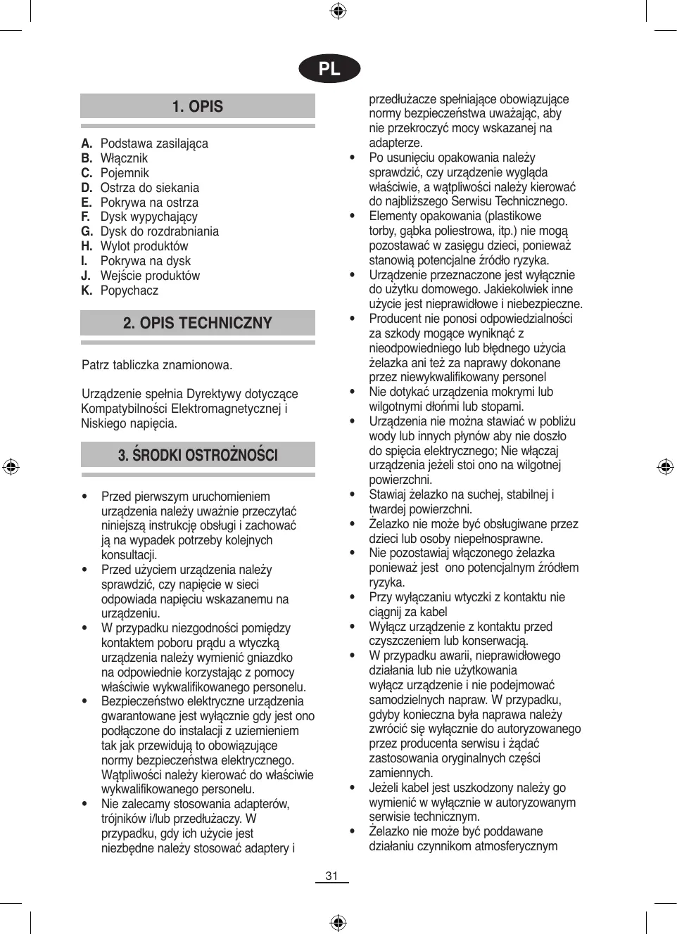 • Técnica autorizado por el fabricante y solicitar el uso de recambios originales. • Si el cable de este aparato resulta dañado, diríjase a un Centro de Asistencia técnico autorizado para que lo sustituyan. • No deje el aparato expuesto a los agentes atmosféricos (lluvia, sol, hielo etc.). • No utilice o coloque ninguna parte de este aparato sobre o cerca de superficies calientes (placas de cocina de gas o eléctrica u hornos). • No utilice detergentes o bayetas abrasivas para limpiar la unidad. • Coloque un recipiente debajo de la boca de salida de alimentos, al trabajar con el disco de rallar y laminar. • No trabaje con la cuchilla o el disco más de 1 minuto cada vez. Después de 1 minuto en funcionamiento, déjelo enfriar 5 minutos. • No intente cortar o trocear alimentos duros, como café, cubitos de hielo, azúcar, arroz, especias, etc. • Retire los huesos y ternillas antes de colocar carne en el vaso. • No corte o ralle alimentos como el queso, tomates, limones, dátiles, melocotones o alimentos congelados. 5. Pulse el interruptor (B) y presione los alimentos lentamente con la pieza de empuje (K) (fig. 7). 6. El aparato permanecerá en funcionamiento durante el tiempo que tenga presionado el interruptor. 7. Retire la tapa de disco (I) solo cuando los discos de rallar y laminar hayan dejado de girar. 8. Desenchufe el aparato EN 1. DESCRIPTION A. B. C. D. Électromagnétique et de Basse Tension.
