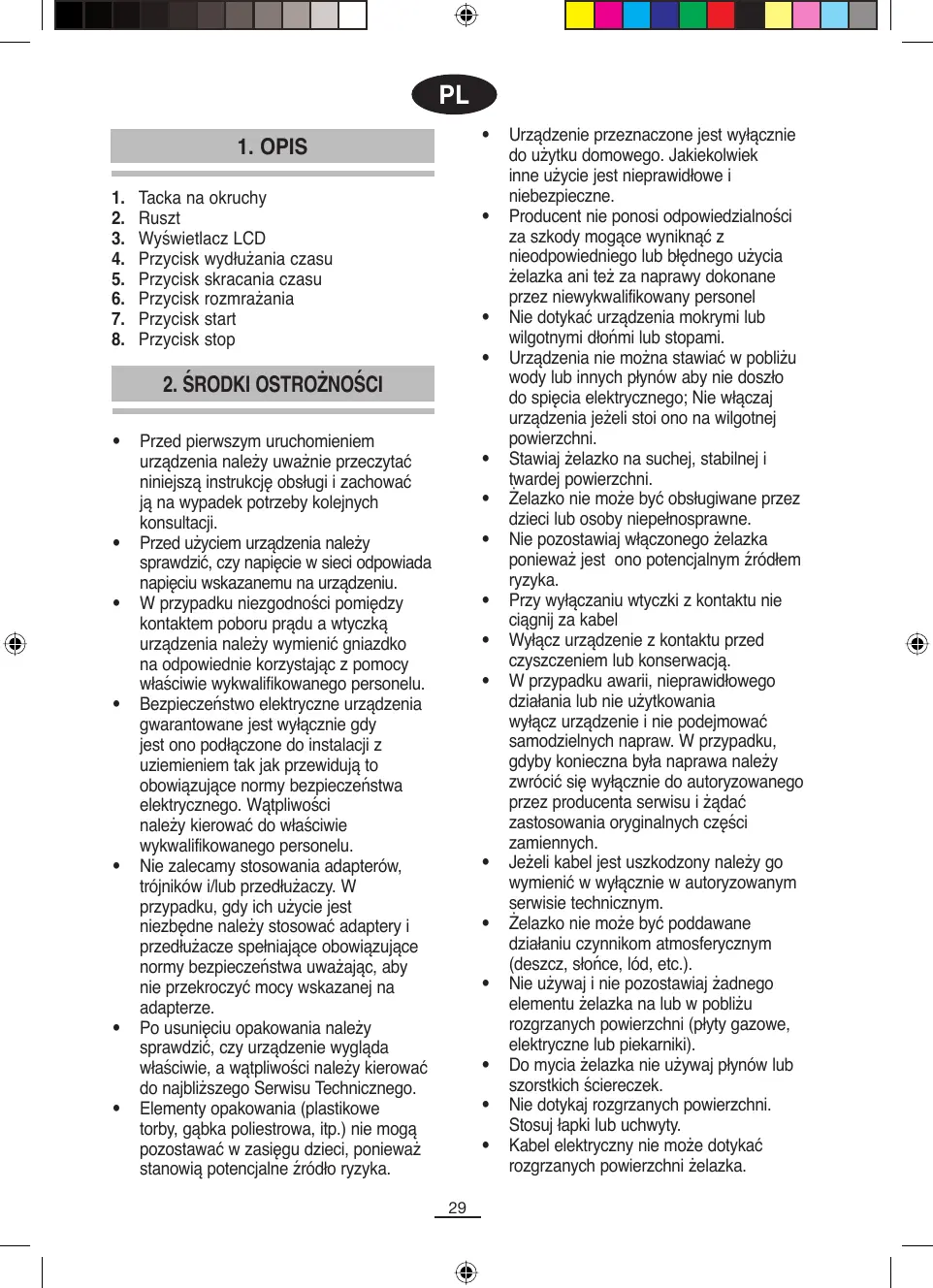 Urządzenie przeznaczone jest wyłącznie do użytku domowego. Jakiekolwiek inne użycie jest nieprawidłowe i niebezpieczne. Producent nie ponosi odpowiedzialności za szkody mogące wyniknąć z nieodpowiedniego lub błędnego użycia żelazka ani też za naprawy dokonane przez niewykwalifikowany personel Nie dotykać urządzenia mokrymi lub wilgotnymi dłońmi lub stopami. Urządzenia nie można stawiać w pobliżu wody lub innych płynów aby nie doszło do spięcia elektrycznego; Nie włączaj urządzenia jeżeli stoi ono na wilgotnej powierzchni. Stawiaj żelazko na suchej, stabilnej i twardej powierzchni. Żelazko nie może być obsługiwane przez dzieci lub osoby niepełnosprawne. Nie pozostawiaj włączonego żelazka ponieważ jest ono potencjalnym źródłem ryzyka. Przy wyłączaniu wtyczki z kontaktu nie ciągnij za kabel Wyłącz urządzenie z kontaktu przed czyszczeniem lub konserwacją. W przypadku awarii, nieprawidłowego działania lub nie użytkowania wyłącz urządzenie i nie podejmować samodzielnych napraw. W przypadku, gdyby konieczna była naprawa należy zwrócić się wyłącznie do autoryzowanego przez producenta serwisu i żądać zastosowania oryginalnych części zamiennych. Jeżeli kabel jest uszkodzony należy go wymienić w wyłącznie w autoryzowanym serwisie technicznym. Żelazko nie może być poddawane działaniu czynnikom atmosferycznym (deszcz, słońce, lód, etc.). Nie używaj i nie pozostawiaj żadnego elementu żelazka na lub w pobliżu rozgrzanych powierzchni (płyty gazowe, elektryczne lub piekarniki). Do mycia żelazka nie używaj płynów lub szorstkich ściereczek. Nie dotykaj rozgrzanych powierzchni. Stosuj łapki lub uchwyty. Kabel elektryczny nie może dotykać rozgrzanych powierzchni żelazka.