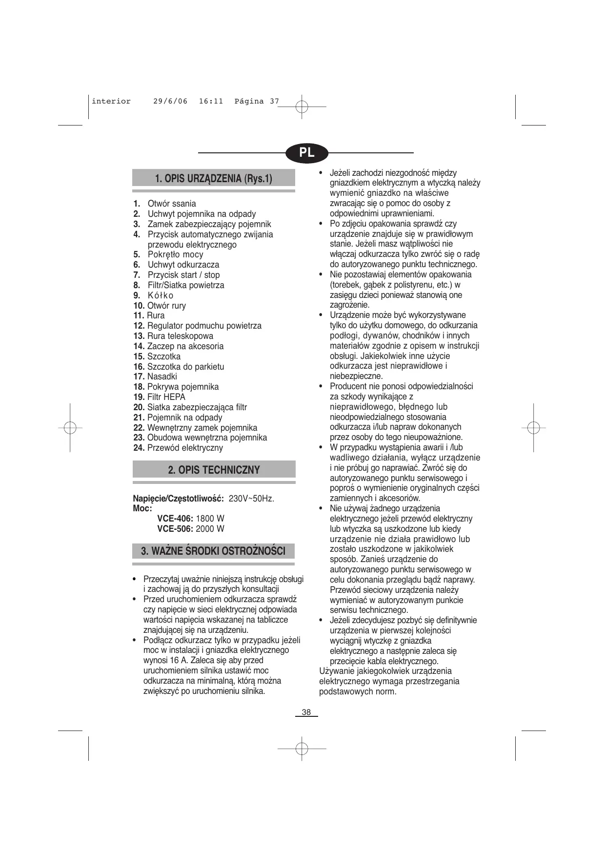 - Jeżeli zdecydujesz pozbyć się definitywnie urządzenia w pierwszej kolejności wyciągnij wtyczkę z gniazdka elektrycznego a następnie zaleca się przecięcie kabla elektrycznego. Używanie jakiegokolwiek urządzenia elektrycznego wymaga przestrzegania podstawowych norm. interior 29/6/06 16:11 Página 38 W szczególności