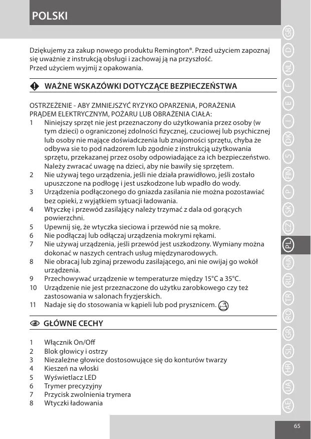 UA F WAŻNE WSKAZÓWKI DOTYCZĄCE BEZPIECZEŃSTWA AE Dziękujemy za zakup nowego produktu Remington®. Przed użyciem zapoznaj się uważnie z instrukcją obsługi i zachowaj ją na przyszłość. Przed użyciem wyjmij z opakowania.