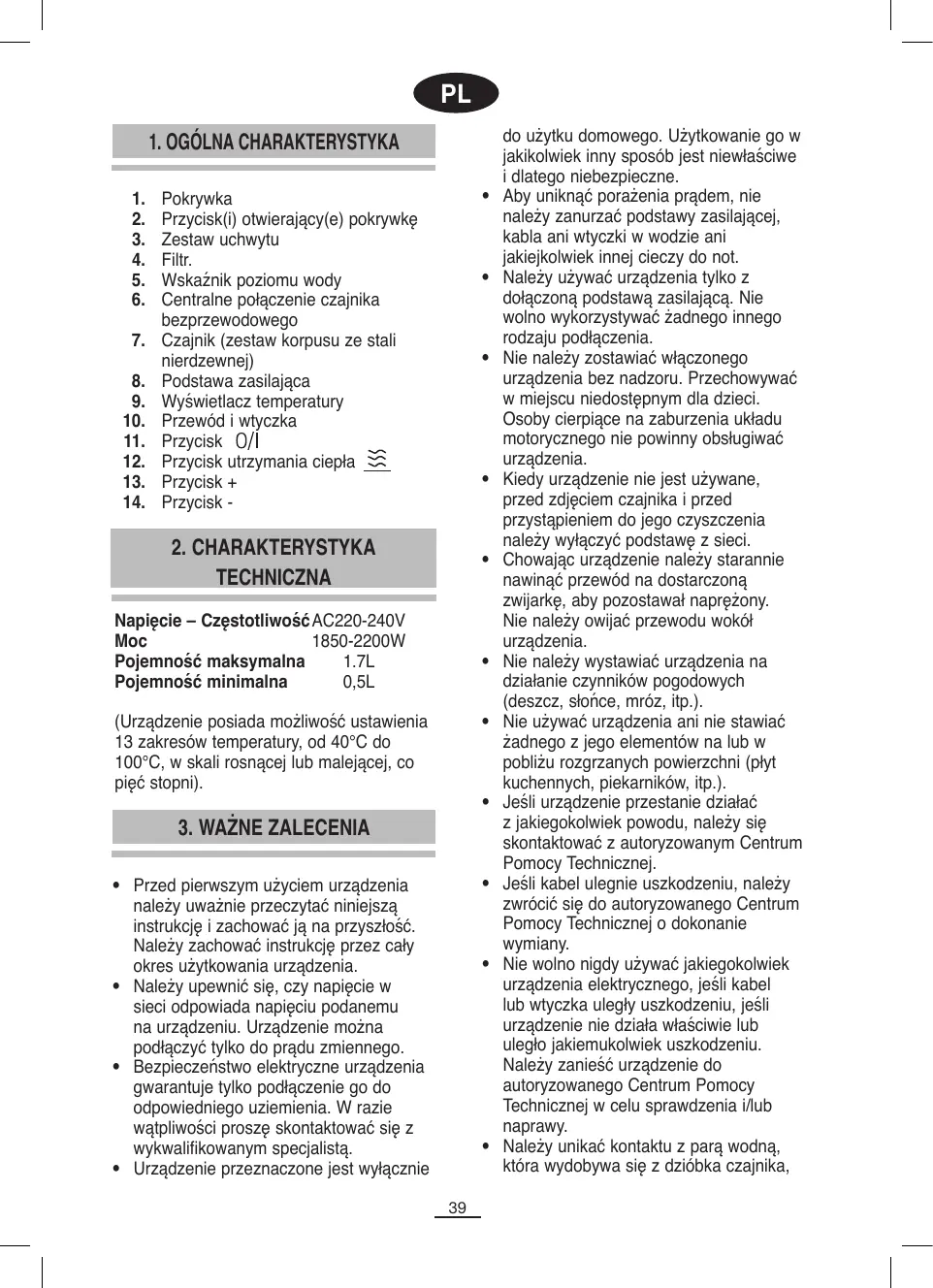 Débranchez la base de branchement de la prise du secteur lorsque vous ne l’utilisez pas, avant de mettre en place ou d’enlever la bouilloire ou avant de procéder à son nettoyage. Avant de ranger la bouilloire, veillez à bien enrouler le cordon autour de l’enrouleur. Ne jamais enrouler le cordon autour du corps de la bouilloire. N’exposez pas l’appareil aux agents atmosphériques (pluie, soleil, gel, etc.) N’utilisez ou ne posez aucune partie de cet appareil sur des surfaces chaudes ou près de celles-ci (plaques de cuisson, fours, etc.) Si l’appareil cesse de fonctionner, adressez-vous uniquement à un centre d’assistance technique agréé. Si le cordon de cet appareil est endommagé, adressez-vous à un Centre d’Assistance technique agréé pour le remplacer. N’utilisez aucun appareil électrique si le cordon ou la fiche est endommagé(e), ou si l’appareil ne fonctionne pas comme il faut ou encore s’il a été endommagé d’une façon ou d’une autre. Adressezvous à un centre d’assistance technique agréé pour l’examiner, le réparer ou le régler. Evitez le contact avec la vapeur provenant du bec verseur lorsque l’eau bout. Veillez surtout à ne pas vous brûler en retirant le couvercle de la bouilloire. Ne remplissez pas la bouilloire au-delà de l’indication « MAXI », afin d’éviter que