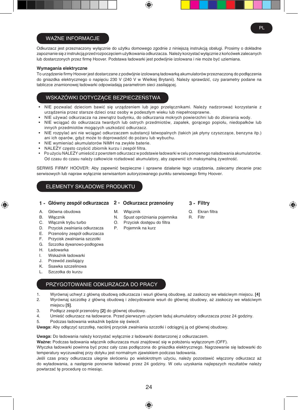 PL WAŻNE INFORMACJE Odkurzacz jest przeznaczony wyłącznie do użytku domowego zgodnie z niniejszą instrukcją obsługi. Prosimy o dokładne zapoznanie się z instrukcją przed rozpoczęciem użytkowania odkurzacza. Należy korzystać wyłącznie z końcówek zalecanych lub dostarczonych przez firmę Hoover. Podstawa ładowarki jest podwójnie izolowana i nie może być uziemiana.