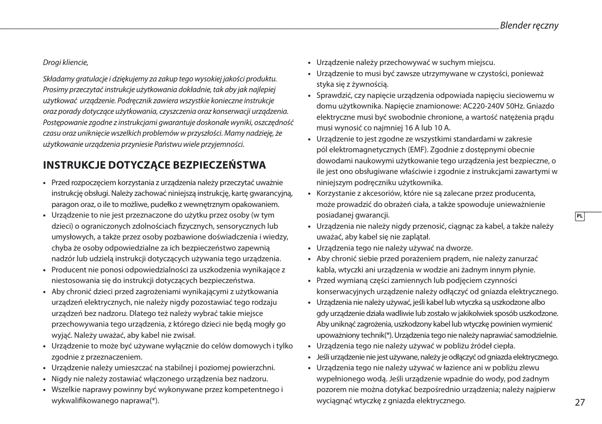 - Urzadzenia to nie jest przyznaczone do uzytku przyez osoby (w tym daneci) o agronomiczych zdolnosciach fizycznych, sensorycznych lub umysłowych, a tatsächze przyez osoby pozbawione doswiadczenia i wiedzy, chyba ze osoby odpowiedzialne za ich bezpieczność zapewnia nadźor lub udzielą instrukcji dotycznych uzywania untozadzenia.