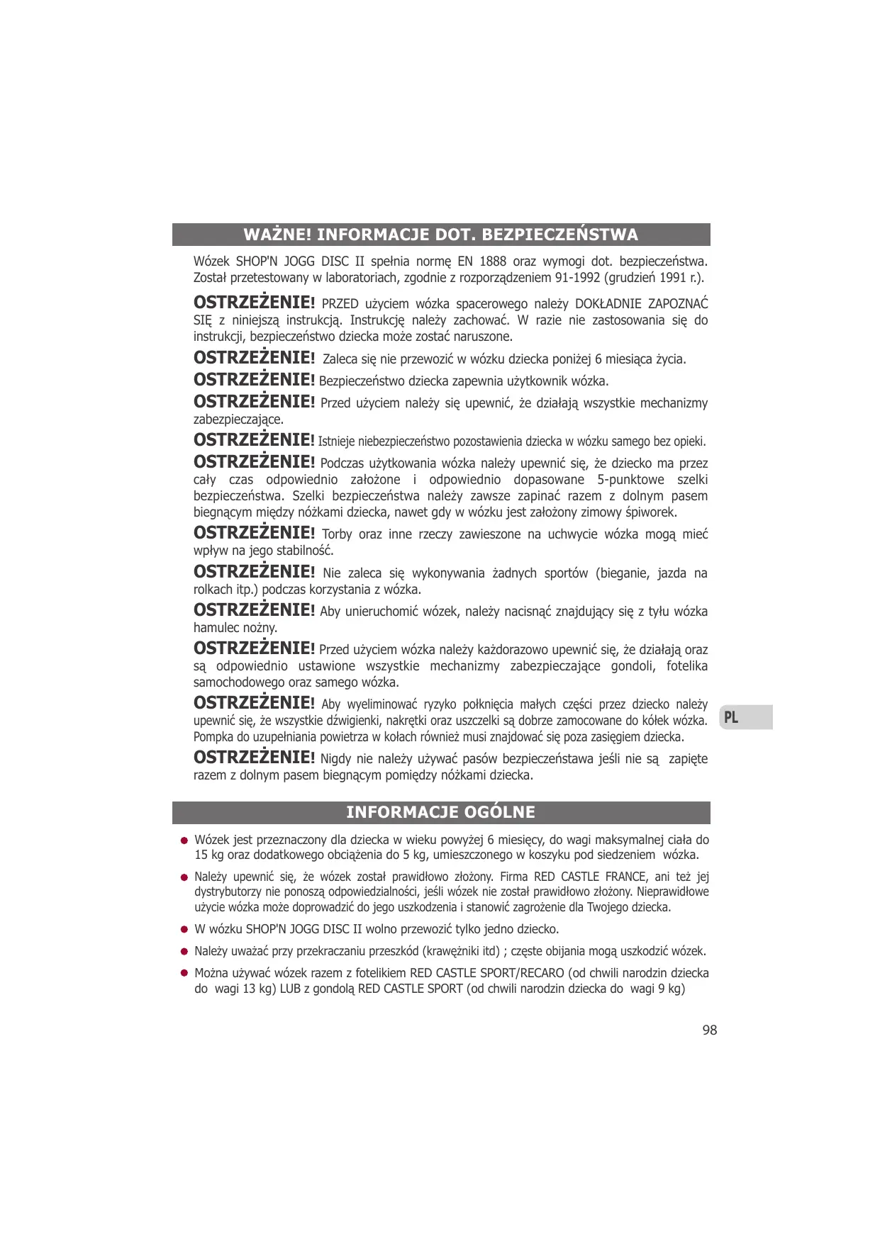 INSTRUCTIONS GENERALES Cette poussette est conçue pour transporter un enfant âgé de 6 mois et jusqu'à un poids maximum de 15 kg, ainsi qu'une charge additionnelle de 5 kg dans le panier sous la poussette. Dès la naissance, utilisez la poussette en combiné avec le Siège Auto RED CASTLE SPORT / RECARO Groupe 0+ jusqu'à 13 kg OU avec la nacelle RED CASTLE SPORT jusqu'à 9 kg. Dès la naissance, utilisez la poussette en combiné avec le Siège Auto RCS Groupe 0 jusqu'à 9 kg. Ce combiné est conforme aux exigences de sécurité et a été testé en laboratoire agréé selon décret 91-1992 (décembre 1991). L'assemblage correct du produit est essentiel et n'engage la responsabilité ni du distributeur, ni celle de RED CASTLE FRANCE. Notez qu'une utilisation incorrecte peut endommager votre poussette et mettre en danger votre enfant. Ne transportez jamais plus d'un enfant dans la poussette SHOP'N JOGG DISC II.