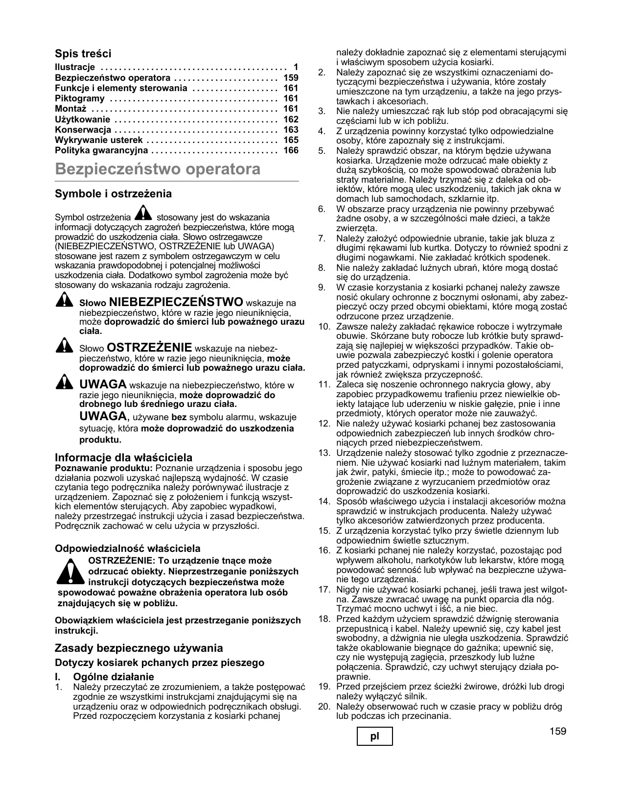 Prendre connaissance de toutes les étiquettes de sécurité et de fonctionnement présentes sur la machine, les équipements et les accessoires. Ne pas mettre les mains ou les pieds à proximité ou sous les parties tournantes. Ne confier l’utilisation de la tondeuse qu’à des personnes responsables, familiarisées avec les instructions. Inspecter la zone où la tondeuse sera utilisée. Celle-ci peut projeter à haute vitesse des petits objets pouvant provoquer des blessures ou des dégâts. Ne pas l’utiliser à proximité d’objets susceptibles de se casser tels que fenêtres, vitres de voiture, serres, etc. Ne laisser personne approcher de la zone de fonctionnement, en particulier les enfants et les animaux domestiques. Porter des vêtements appropriés comme une chemise à manches longues ou une veste. Porter aussi des pantalons ou salopettes. Ne pas porter de shorts. Ne pas porter de vêtements amples qui risqueraient de se prendre dans l’équipement. Toujours porter des lunettes de sécurité avec œillères de protection pendant l’utilisation de la tondeuse à conducteur marchant pour se protéger les yeux d’objets qui pourraient être projetés par la tondeuse Porter toujours des gants et des chaussures de travail. Des chaussures de travail ou des bottines en cuir sont appropriées pour pratiquement tout le monde. Elles protègent les chevilles et les tibias des petites branches, des échardes et autres débris et améliorent la mobilité. Il est recommandé de se munir d’une protection de la tête pour éviter le risque d’être touché par de petites particules volantes ou par des branches basses, brindilles ou autres objets que l’opérateur n’aurait pas remarqué. Ne jamais faire fonctionner la tondeuse à conducteur marchant sans ses protections, plaques ou autres dispositifs de sécurité. N’utiliser cet équipement que dans le cadre de son utilisation prévue. Ne pas faire passer la tondeuse sur des matériaux non fixés comme du gravier, des brindilles, des ordures, etc., qui présentent un risque de projection et d’endommagement de la tondeuse. Voir les instructions du fabricant pour l’installation et l’utilisation des accessoires. N’utiliser que des accessoires approuvés par le fabricant. N’utiliser qu’à la lumière du jour ou sous un éclairage artificiel suffisant. Ne pas faire fonctionner la tondeuse à conducteur marchant sous l’influence de l’alcool, de drogues ou de médicaments qui peuvent provoquer une somnolence ou affecter la capacité à l’utiliser. Ne pas utiliser la tondeuse à conducteur marchant avec de l’herbe humide. Avoir toujours le pied ferme, bien tenir la poignée et marcher, ne jamais courir. Avant chaque utilisation, inspecter le levier et le câble de la commande d’accélérateur. S’assurer que le câble n’est pas coincé et que le levier n’est pas endommagé. Vérifier aussi que les biellettes entre le câble et le carburateur ne sont pas tordues, n’ont pas perdu d’écrou et pivotent librement. Vérifier que le levier de commande fonctionne normalement. Couper le moteur pour traverser des allées, des passages ou des routes en gravier.