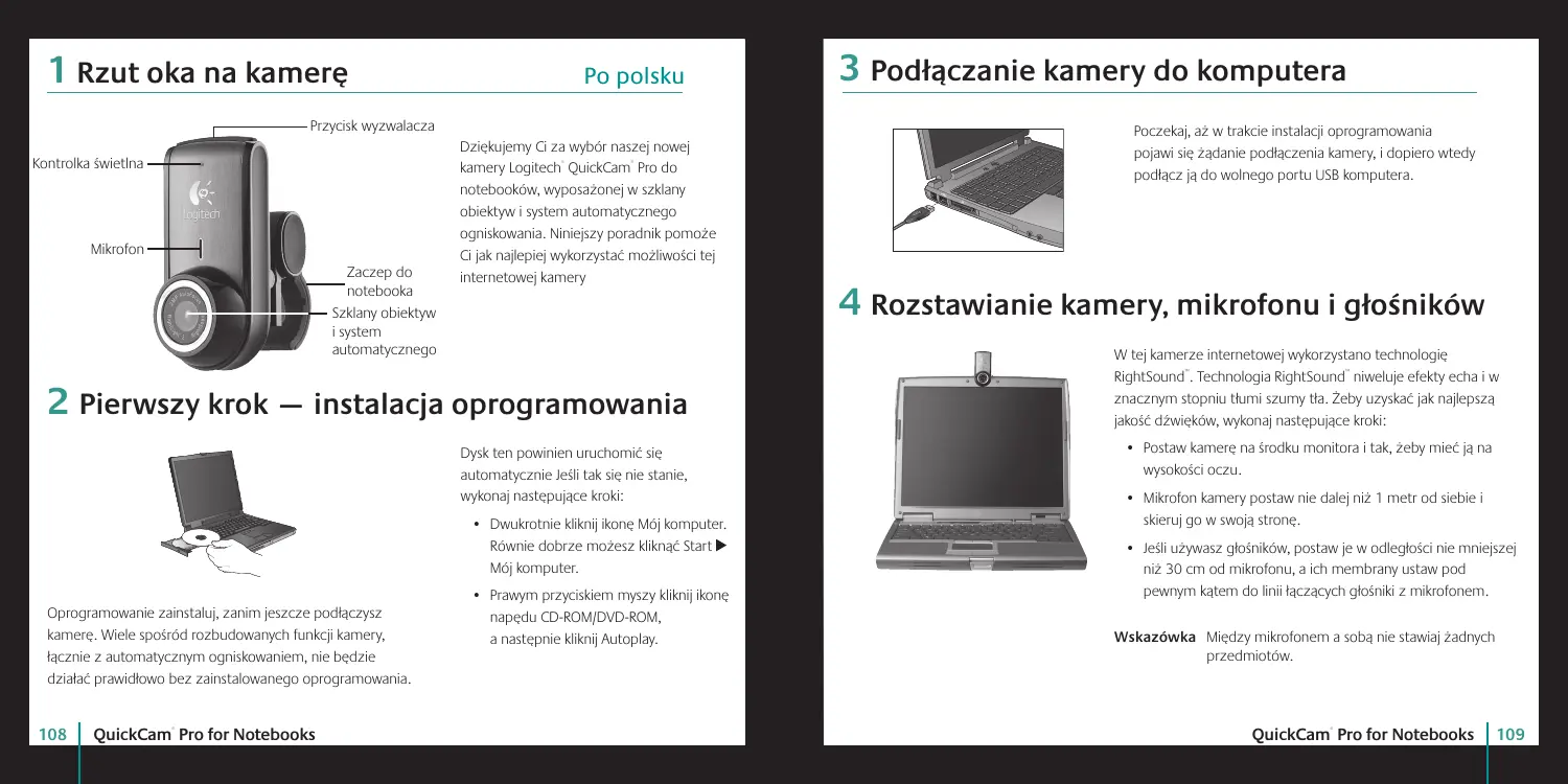 kamery Logitech QuickCam Pro do notebooków, wyposażonej w szklany obiektyw i system automatycznego ogniskowania. Niniejszy poradnik pomoże Ci jak najlepiej wykorzystać możliwości tej internetowej kamery 2 Pierwszy krok — instalacja oprogramowania Dysk ten powinien uruchomić się automatycznie Jeśli tak się nie stanie, wykonaj następujące kroki: