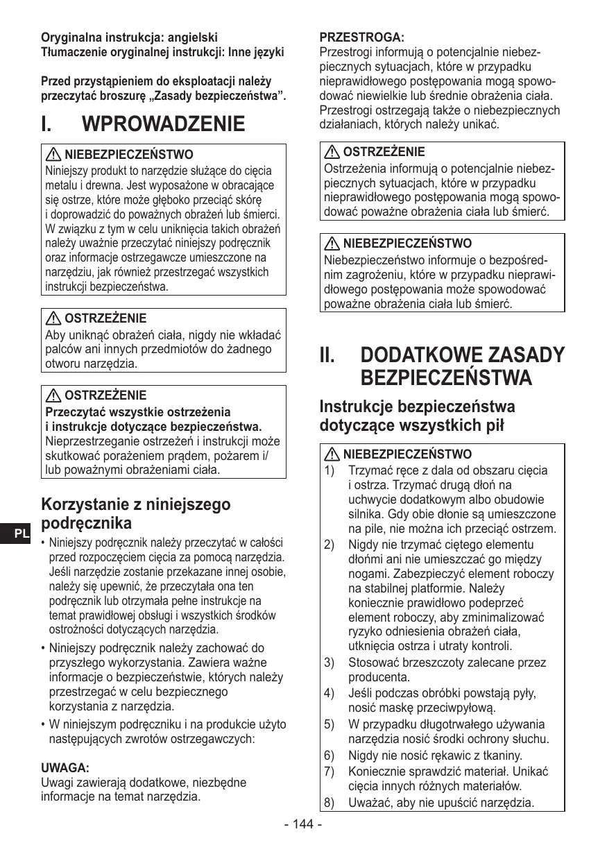 Niniejszy produkt to narędzie slówne do cięcia metalu i drewna. Ist ywposzazone w obracajcie ostrze, kto're sągne glęboko prȩciąskó i doprowadźć do powaznych obrażń lub smierci. W zwiazku z tym w celu uniknięcia takich obrażné nały uwaźnie przyeczytać niniejszy podręcznik oraz informacje ostrzejagwcze umieszczone na narędziu, jak rownik przyestrzejność wszystkich instrukcj bezmieczność.