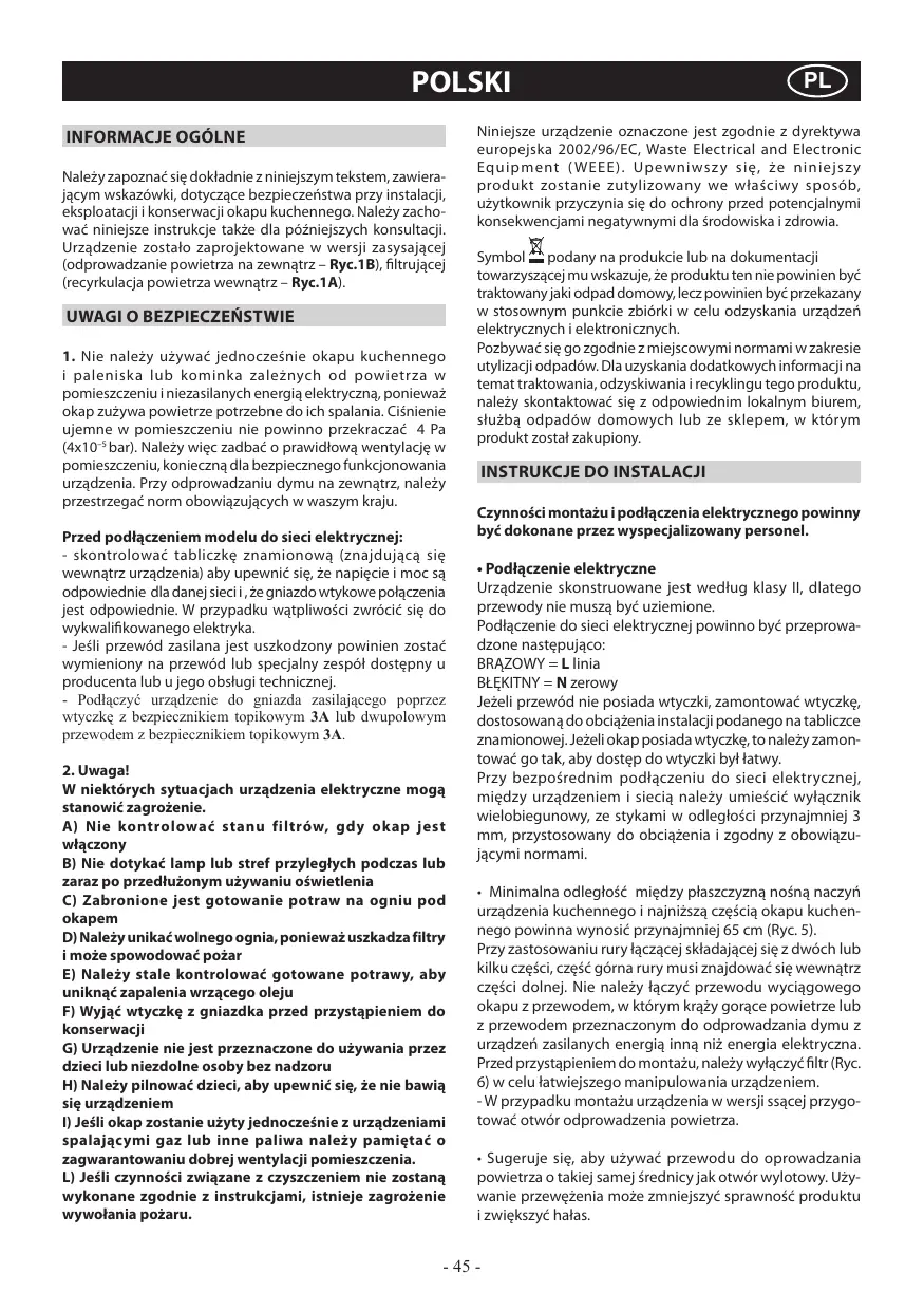Avant de brancher la hotte au réseau de distribution électrique: - lire les données reportées sur la plaquette d’identification (appliquée à l’intérieur de la hotte) pour vérifier si le voltage et la puissance correspondent à ceux du réseau. Contrôler aussi si la prise est adaptée. - En cas de doutes, contacter un électricien qualifié. Si le câble d’alimentation est abîmé, il faut le remplacer par un autre câble ou par un ensemble, spécialement prévus, que vous pouvez commander au fabricant ou à un de ses services d’assistance technique. - Raccorder le dispositif au secteur à l’aide d’une prise avec fusible 3A ou aux deux fils du diphasé protégés par un fusible 3A. 2. Attention ! Dans certaines circonstances les électroménagers peuvent être dangereux. A) N’essayez pas de contrôler l’état des filtres quand la hotte est en marche. B) Ne jamais toucher les lampes et les zones adjacentes, pendant et tout de suite après l’utilisation prolongée de l’éclairage. C) Il est absolument interdit de flamber sous la hotte. D) Évitez de laisser des flammes libres, elles sont dangereuses pour les filtres et pour les risques d’incendie. E) Surveillez constamment les fritures pour éviter que l’huile surchauffée prenne feu. F) Avant de procéder à toute opération d’entretien, coupez l’alimentation électrique de la hotte. G) Cet appareil ne peut pas être utilisé par des enfants ou par des personnes nécessitant une surveillance. H) Veillez à ce que les enfants ne jouent pas avec l’appareil. I) Lorsque la hotte est utilisée en présence d’appareils utilisant du gaz ou d’autres combustibles, la pièce doit être correctement ventilée.