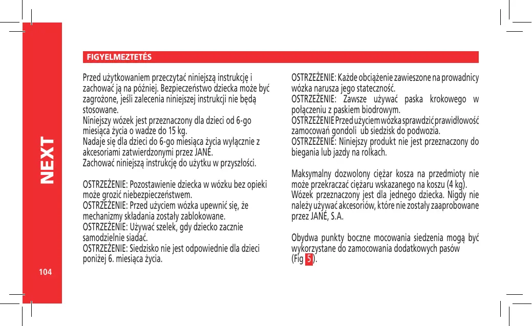 AVERTISSEMENT: Ne pas utiliser ce produit en faisant du jogging ou des promenades en rollers. Le poids maximum autorisé dans le filet du panier ne doit pas être supérieur à celui qui est indiqué dans le filet (4 kg). Cette poussette ne peut être utilisée que par un enfant. N’utilisez jamais des accessoires qui n’ont pas été approuvés par JANE, S.A. Les deux points de fixation latéraux du siège peuvent être utilisés pour fixer un harnais supplémentaire (voir chapitre 5 ). AVERTISSEMENT: L’enfant doit se tenir éloigné des parties mobiles lorsque celles-ci sont manipulées par un adulte responsable. Il y a des risques de coupures, de compression, de se trouver coincé qui sont inévitables lors de ces opérations.