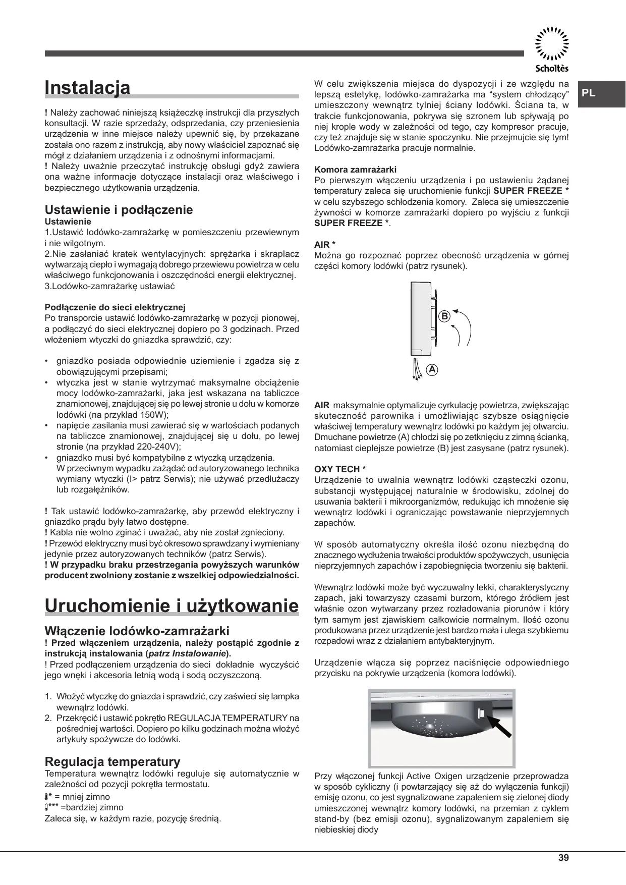 W celu zwiększenia miejsca do dyspozycji i ze względu na lepszą estetykę, lodówko-zamrażarka ma “system chłodzący” umieszczony wewnątrz tylniej ściany lodówki. Ściana ta, w trakcie funkcjonowania, pokrywa się szronem lub spływają po niej krople wody w zależności od tego, czy kompresor pracuje, czy też znajduje się w stanie spoczynku. Nie przejmujcie się tym! Lodówko-zamrażarka pracuje normalnie. Komora zamrażarki Po pierwszym włączeniu urządzenia i po ustawieniu żądanej temperatury zaleca się uruchomienie funkcji SUPER FREEZE * w celu szybszego schłodzenia komory. Zaleca się umieszczenie żywności w komorze zamrażarki dopiero po wyjściu z funkcji SUPER FREEZE *. AIR * Można go rozpoznać poprzez obecność urządzenia w górnej części komory lodówki (patrz rysunek).