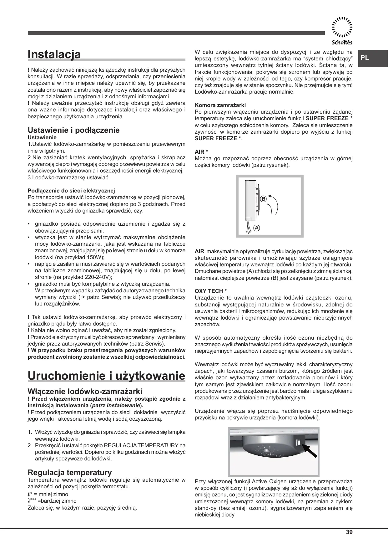 W celu zwiększenia miejsca do dyspozycji i ze względu na lepszą estetykę, lodówko-zamrażarka ma “system chłodzący” umieszczony wewnątrz tylniej ściany lodówki. Ściana ta, w trakcie funkcjonowania, pokrywa się szronem lub spływają po niej krople wody w zależności od tego, czy kompresor pracuje, czy też znajduje się w stanie spoczynku. Nie przejmujcie się tym! Lodówko-zamrażarka pracuje normalnie. Komora zamrażarki Po pierwszym włączeniu urządzenia i po ustawieniu żądanej temperatury zaleca się uruchomienie funkcji SUPER FREEZE * w celu szybszego schłodzenia komory. Zaleca się umieszczenie żywności w komorze zamrażarki dopiero po wyjściu z funkcji SUPER FREEZE *. AIR * Można go rozpoznać poprzez obecność urządzenia w górnej części komory lodówki (patrz rysunek).