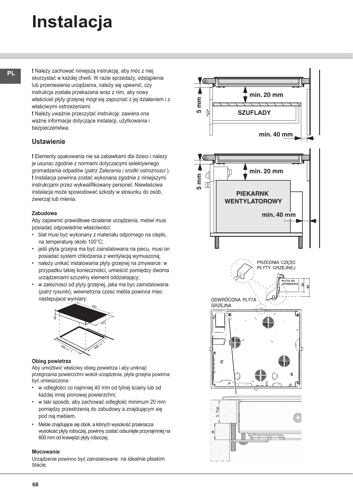• w odległości co najmniej 40 mm od tylnej ściany lub od każdej innej pionowej powierzchni; • w taki sposób, aby zachować odległość minimum 20 mm pomiędzy przestrzenią do zabudowy a znajdującym się pod nią meblem. • Meble znajdujące się obok, a których wysokość przekracza wysokość płyty roboczej, powinny zostać odsunięte przynajmniej na 600 mm od krawędzi płyty roboczej.