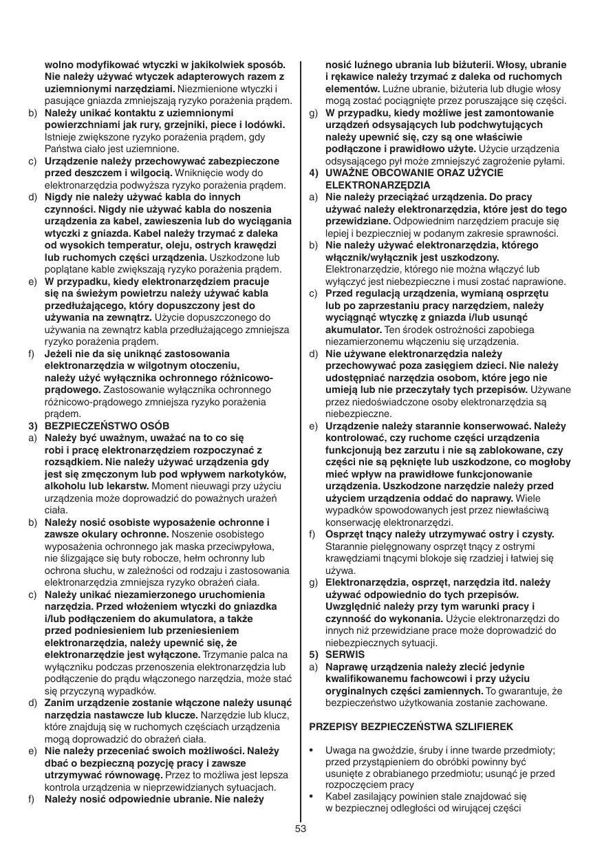 1) BEZPIECZEŃSTWO MIEJSCA PRACY a) Miejsce pracy należy utrzymywać w czystości i dobrze oświetlone. Nieporządek lub nie oświetlone miejsce pracy mogą doprowadzić do wypadków. b) Nie należy pracować tym narzędziem w otoczeniu zagrożonym wybuchem, w którym znajdują się np. łatwopalne ciecze, gazy lub pyły. Elektronarzędzia wytwarzają iskry, które mogą podpalić ten pył lub pary. c) Elektronarzędzie trzymać podczas pracy z daleka od dzieci i innych osób. Przy nieuwadze można stracić kontrolę nad narzędziem. 2) BEZPIECZEŃSTWO ELEKTRYCZNE a) Wtyczka urządzenia musi pasować do gniazda. Nie 52