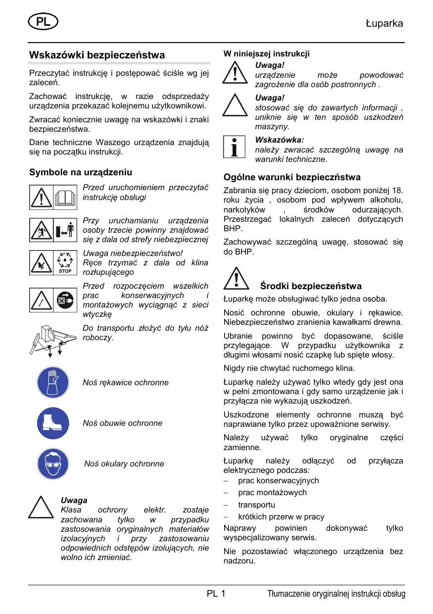 Środki bezpieczeństwa Łuparkę może obsługiwać tylko jedna osoba. Nosić ochronne obuwie, okulary i rękawice. Niebezpieczeństwo zranienia kawałkami drewna. Ubranie powinno być dopasowane, ściśle przylegające. W przypadku użytkownika z długimi włosami nosić czapkę lub spięte włosy. Nigdy nie chwytać ruchomego klina. Łuparkę należy używać tylko wtedy gdy jest ona w pełni zmontowana i gdy samo urządzenie jak i przyłącza nie wykazują uszkodzeń.