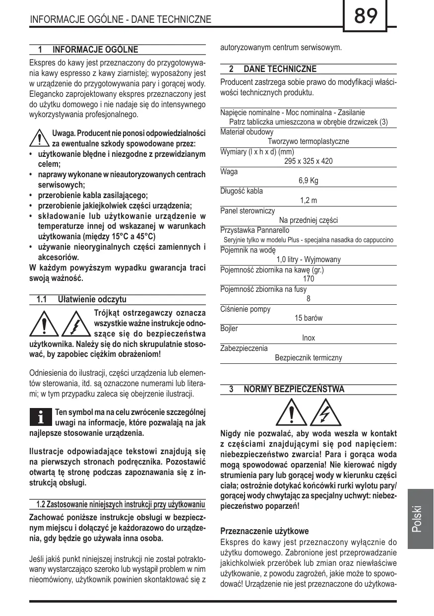 Nigdy nie pozwalać, aby woda weszła w kontakt z częściami znajdującymi się pod napięciem: niebezpieczeństwo zwarcia! Para i gorąca woda mogą spowodować oparzenia! Nie kierować nigdy strumienia pary lub gorącej wody w kierunku części ciała; ostrożnie dotykać końcówki rurki wylotu pary/ gorącej wody chwytając za specjalny uchwyt: niebezpieczeństwo poparzeń! Przeznaczenie użytkowe Ekspres do kawy jest przeznaczony wyłącznie do użytku domowego. Zabronione jest przeprowadzanie jakichkolwiek przeróbek lub zmian oraz niewłaściwe użytkowanie, z powodu zagrożeń, jakie może to spowodować! Urządzenie nie jest przeznaczone do użytkowa- Polski
