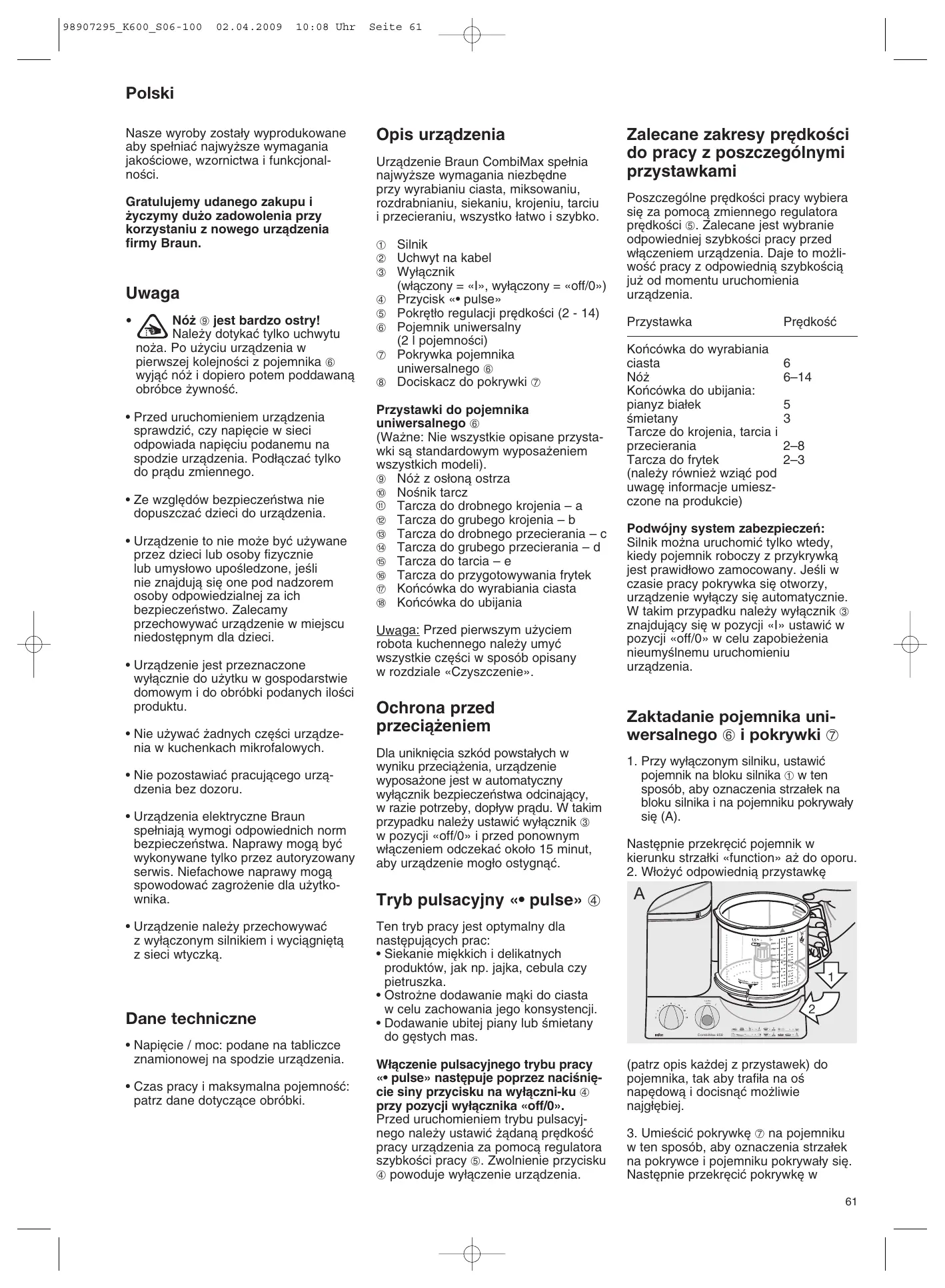 - Czas pracy i maksymalna pojemnoÊç: patrz dane dotyczàce obróbki. Opis urzàdzenia Urzàdzenie Braun CombiMax spe∏nia najwy˝sze wymagania niezb´dne przy wyrabianiu ciasta, miksowaniu, rozdrabnianiu, siekaniu, krojeniu, tarciu i przecieraniu, wszystko ∏atwo i szybko. 1 Silnik 2 Uchwyt na kabel 3 Wy∏àcznik (w∏àczony = «I», wy∏àczony = «off/0») 4 Przycisk «• pulse» 5 Pokr´t∏o regulacji pr´dkoÊci (2 - 14) 6 Pojemnik uniwersalny (2 l pojemnoÊci) 7 Pokrywka pojemnika uniwersalnego 6 8 Dociskacz do pokrywki 7 Przystawki do pojemnika uniwersalnego 6 (Wa˝ne: Nie wszystkie opisane przystawki sà standardowym wyposa˝eniem wszystkich modeli). 9 Nó˝ z os∏onà ostrza j NoÊnik tarcz q Tarcza do drobnego krojenia – a l Tarcza do grubego krojenia – b m Tarcza do drobnego przecierania – c n Tarcza do grubego przecierania – d o Tarcza do tarcia – e p Tarcza do przygotowywania frytek q Koƒcówka do wyrabiania ciasta r Koƒcówka do ubijania Uwaga: Przed pierwszym u˝yciem robota kuchennego nale˝y umyç wszystkie cz´Êci w sposób opisany w rozdziale «Czyszczenie». Ochrona przed przecià˝eniem Dla unikni´cia szkód powsta∏ych w wyniku przecià˝enia, urzàdzenie wyposa˝one jest w automatyczny wy∏àcznik bezpieczeƒstwa odcinajàcy, w razie potrzeby, dop∏yw pràdu. W takim przypadku nale˝y ustawiç wy∏àcznik 3 w pozycji «off/0» i przed ponownym w∏àczeniem odczekaç oko∏o 15 minut, aby urzàdzenie mog∏o ostygnàç. Tryb pulsacyjny «• pulse» 4 Ten tryb pracy jest optymalny dla nast´pujàcych prac: