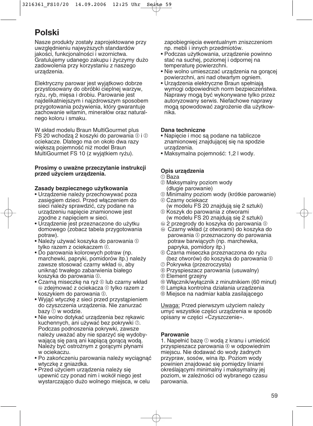 12:25 Uhr Seite 59 Polski Nasze produkty zosta∏y zaprojektowane przy uwzgl´dnieniu najwy˝szych standardów jakoÊci, funkcjonalnoÊci i wzornictwa. Gratulujemy udanego zakupu i ˝yczymy du˝o zadowolenia przy korzystaniu z naszego urzàdzenia. Elektryczny parowar jest wyjàtkowo dobrze przystosowany do obróbki cieplnej warzyw, ry˝u, ryb, mi´sa i drobiu. Parowanie jest najdelikatniejszym i najzdrowszym sposobem przygotowania po˝ywienia, który gwarantuje zachowanie witamin, minera∏ów oraz naturalnego koloru i smaku. W sk∏ad modelu Braun MultiGourmet plus FS 20 wchodzà 2 koszyki do parowania 5 i 2 ociekacze. Dlatego ma on oko∏o dwa razy wi´kszà pojemnoÊç ni˝ model Braun MultiGourmet FS 10 (z wyjàtkiem ry˝u). Prosimy o uwa˝ne przeczytanie instrukcji przed u˝yciem urzàdzenia. Zasady bezpiecznego u˝ytkowania
