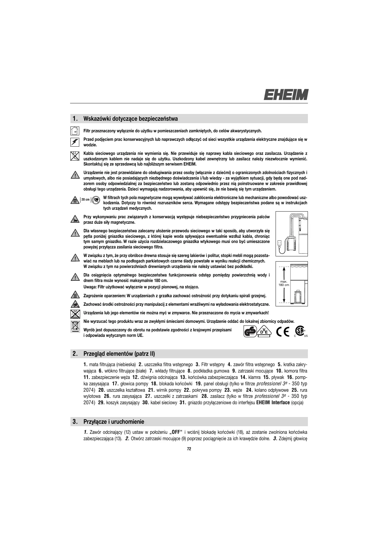 Filtr przeznaczony wyłącznie do użytku w pomieszczeniach zamkniętych, do celów akwarystycznych. Przed podjęciem prac konserwacyjnych lub naprawczych odłączyć od sieci wszystkie urządzenia elektryczne znajdujące się w wodzie. Kabla sieciowego urządzenia nie wymienia się. Nie przewiduje się naprawy kabla sieciowego oraz zasilacza. Urządzenie z uszkodzonym kablem nie nadaje się do użytku. Uszkodzony kabel zewnętrzny lub zasilacz należy niezwłocznie wymienić. Skontaktuj się ze sprzedawcą lub najbliższym serwisem EHEIM. Urządzenie nie jest przewidziane do obsługiwania przez osoby (włącznie z dziećmi) o ograniczonych zdolnościach fizycznych i umysłowych, albo nie posiadających niezbędnego doświadczenia i/lub wiedzy - za wyjątkiem sytuacji, gdy będą one pod nadzorem osoby odpowiedzialnej za bezpieczeństwo lub zostaną odpowiednio przez nią poinstruowane w zakresie prawidłowej obsługi tego urządzenia. Dzieci wymagają nadzorowania, aby upewnić się, że nie bawią się tym urządzeniem. 20 cm W filtrach tych pola magnetyczne mogą wywoływać zakłócenia elektroniczne lub mechaniczne albo powodować uszkodzenia. Dotyczy to również rozruszników serca. Wymagane odstępy bezpieczeństwa podane są w instrukcjach tych urządzeń medycznych. Przy wykonywaniu prac związanych z konserwacją występuje niebezpieczeństwo przygniecenia palców przez duże siły magnetyczne. Dla własnego bezpieczeństwa zalecamy ułożenie przewodu sieciowego w taki sposób, aby utworzyła się pętla poniżej gniazdka sieciowego, z której kapie woda spływająca ewentualnie wzdłuż kabla, chroniąc tym samym gniazdko. W razie użycia rozdzielaczowego gniazdka wtykowego musi ono być umieszczone powyżej przyłącza zasilania sieciowego filtra. W związku z tym, że przy obróbce drewna stosuje się szereg lakierów i politur, stopki mebli mogą pozostawiać na meblach lub na podłogach parkietowych czarne ślady powstałe w wyniku reakcji chemicznych. W związku z tym na powierzchniach drewnianych urządzenia nie należy ustawiać bez podkładki. Dla osiągnięcia optymalnego bezpieczeństwa funkcjonowania odstęp pomiędzy powierzchnią wody i dnem filtra może wynosić maksymalnie 180 cm. Uwaga: Filtr użytkować wyłącznie w pozycji pionowej, na stojąco. max. 180 cm Zagrożenie oparzeniem: W urządzeniach z grzałka zachować ostrożność przy dotykaniu spirali grzejnej. Zachować środki ostrożności przy manipulacij z elementami wrażliwymi na wyładowania elektrostatyczne. Urządzenia lub jego elementów nie można myć w zmywarce. Nie przeznaczone do mycia w zmywarkach! Nie wyrzucać tego produktu wraz ze zwykłymi śmieciami domowymi. Urządzenie oddać do lokalnej zbiornicy odpadów. Wyrób jest dopuszczony do obrotu na podstawie zgodności z krajowymi przepisami i odpowiada wytycznym norm UE. geprüfte Sicherheit