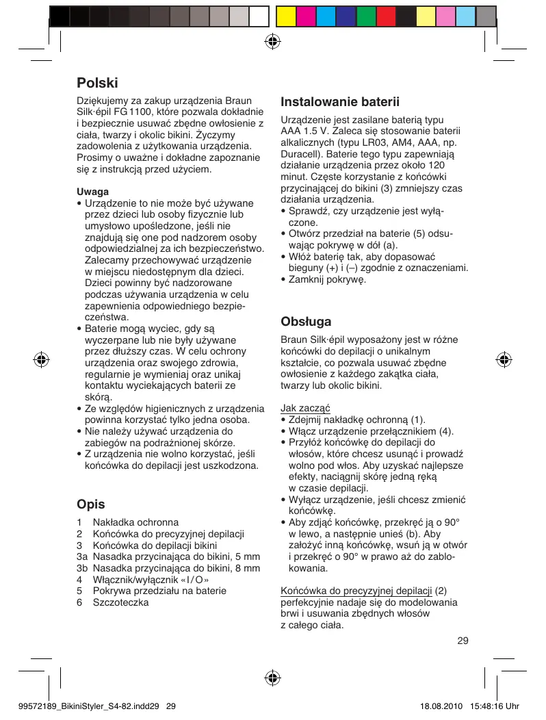 Polski Dziekujemy za zakup urzadzenia Braun Silk-épil FG 1100, ktôre pozwala dokladnie i bezpiecznie usuweaé zbedne owlosienie z ciala, twarzy i okolic bikini. Zyczymy zadowolenia z u2ytkowania urzadzenia. Prosimy o uwazne i dokladne zapoznanie sie z instrukcja przed uyciem. Uwaga + Urzadzenie to nie moe byé uzywane przez dzieci lub osoby fizycznie lub umyslowo upoéledzone, jesli nie znajduja sie one pod nadzorem osoby odpowiedziainej za ich bezpieczeñsto. Zalecamy przechowywaé urzadzenie w miejscu niedostepnym dla dzieci. Dzieci powinny byé nadzorowane podezas uzywania urzadzenia w celu Zapewnienia odpowiedniego bezpie- czeñstwa. Baterie moga wyciec, gdy sa wyczerpane lub nie byiy uéywane przez diuszy czas. W celu ochrony urzadzenia oraz swojego zdrowia, regulamie je wymieniaj oraz unikaj kontaktu wyciekajacych baterii ze skôra + Ze wzgledôw higienicznych z urzadzenia powinna korzystaé tylko jedna osoba. + Nie nalezy uzywaé urzadzenia do zabiegôw na podraznione) skôrze. + Zurzadzenia nie wolno korzystaé, jeéli koñcôwka do depilacji jest uszkodzona. Opis 1 Nakladka ochronna 2 Koñcôwka do precyzyinej depilacii 3 Koñcôwka do depilacii bikini a Nasadka przycinajaca do bikini, 5 mm 8b Nasadka przycinajaca do bikini, 8 mm 4 Wiacznik/wylacznik «1/0» 5 Pokrywa przedzialu na baterie 6 Szczoteczka 99572189 BikiniStyler_S4-82indd29 29