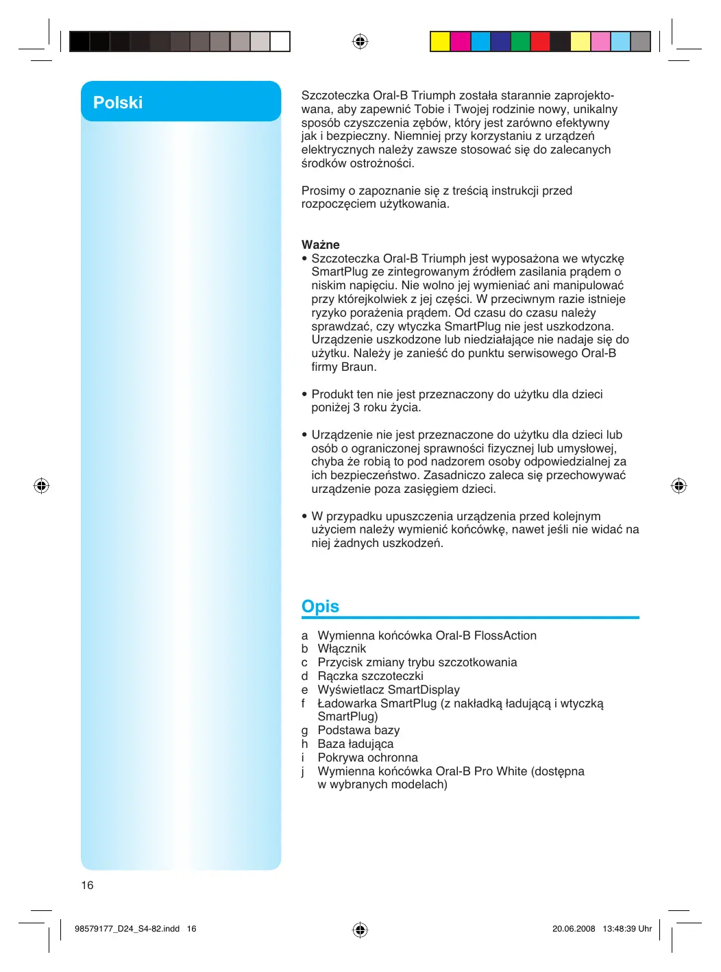 Polski Szczoteczka Oral-B Triumph została starannie zaprojektowana, aby zapewnić Tobie i Twojej rodzinie nowy, unikalny sposób czyszczenia zębów, który jest zarówno efektywny jak i bezpieczny. Niemniej przy korzystaniu z urządzeń elektrycznych należy zawsze stosować się do zalecanych środków ostrożności. Prosimy o zapoznanie się z treścią instrukcji przed rozpoczęciem użytkowania. Ważne
