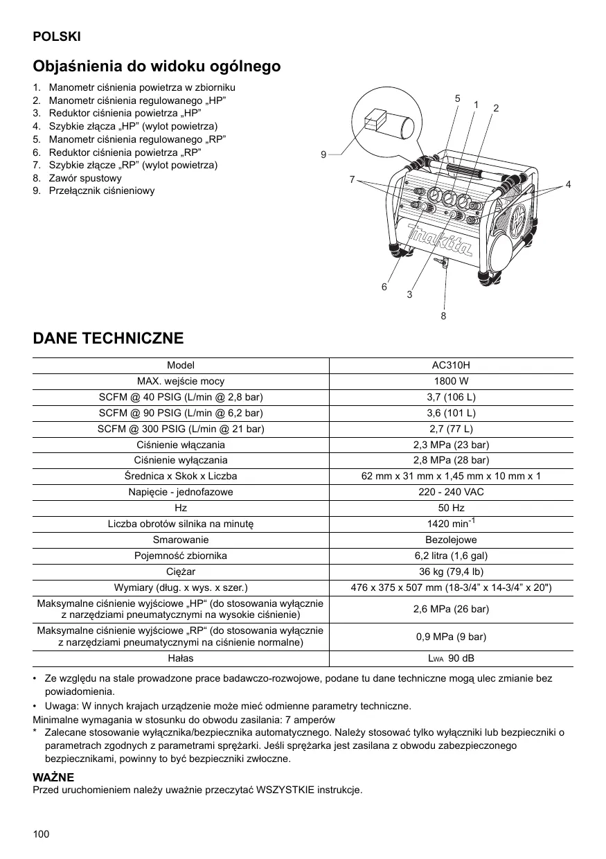 POLSKI Obja$nienia do widoku ogélnego Manometr ciénienia powietrza w zbiorniku Manometr ciénienia regulowanego HP" Reduktor ciénienia powietrza ,HP" .… Szybkie zlacza HP” (wylot powietrza) Manometr ciénienia regulowanego RP" Reduktor ciénienia powietrza ,RP" Szybkie zlacze ,RP” (wylot powietrza) Zawôr spustowy Przelacznik cisnieniowy pLoNHmswp DANE TECHNICZNE Model AC310H MAX. wejécie mocy 1800 W SCFM @ 40 PSIG (L/min @ 2.8 bar) 7 (106 L) SCFM @ 90 PSIG (L/min @ 6,2 bar) 6 (1011) SCFM @ 300 PSIG (L/min @ 21 bar) 27(77L) Ciénienie wiaczania 2,3 MPa (23 bar) Ciénienie wylaczania 2,8 MPa (28 bar) $rednica x Skok x Liczba 62 mm x 31 mm x 1,45 mm x 10 mm x 1 Napiecie - jednofazowe 220 - 240 VAC Hz 50 Hz Liczba obrotéw silnika na minute 1420 min? Smarowanie Bezolejowe Pojemnosé zbiomika 6,2 litra (1,6 gal) Cigzar 36 kg (79,4 Ib) Wymiary (dlug. x wys. x szer.) 476 x 375 x 507 mm (18-3/4" x 14-3/4" x 20") Maksymane ciénienie wyjéciowe ,HP (do stosowania wylacznie 2 narzedziami pneumatycznymi na wysokie ciénienie) 2.6 MPa (26 bar) Maksymalne ciénienie wyjéciowe ,RP* (do stosowania wylacznie 2 narzedziami pneumatycznymi na ciénienie normalne) Halas Lua 90 dB 0,9 MPa (9 bar) + Ze wzgledu na stale prowadzone prace badawczo-rozwojowe, podane tu dane techniczne moga ulec zmianie bez powiadomienia + Uwaga: W innych krajach urzadzenie moze mieé odmienne parametry techniczne. Minimalne wymagania w stosunku do obwodu zasilania: 7 amperéw *_ Zalecane stosowanie wylacznika/bezpiecznika automatycznego. Nale2y stosowaé tylko wylaczniki lub bezpieczniki o parametrach zgodnych z parametrami sprezarki. Jeéli sprezarka jest zasilana z obwodu zabezpieczonego bezpiecznikami, powinny to byé bezpieczniki zwloczne. WA2NE Przed uruchomieniem nalezy uwaënie przeczytaé WSZYSTKIE instrukcje.