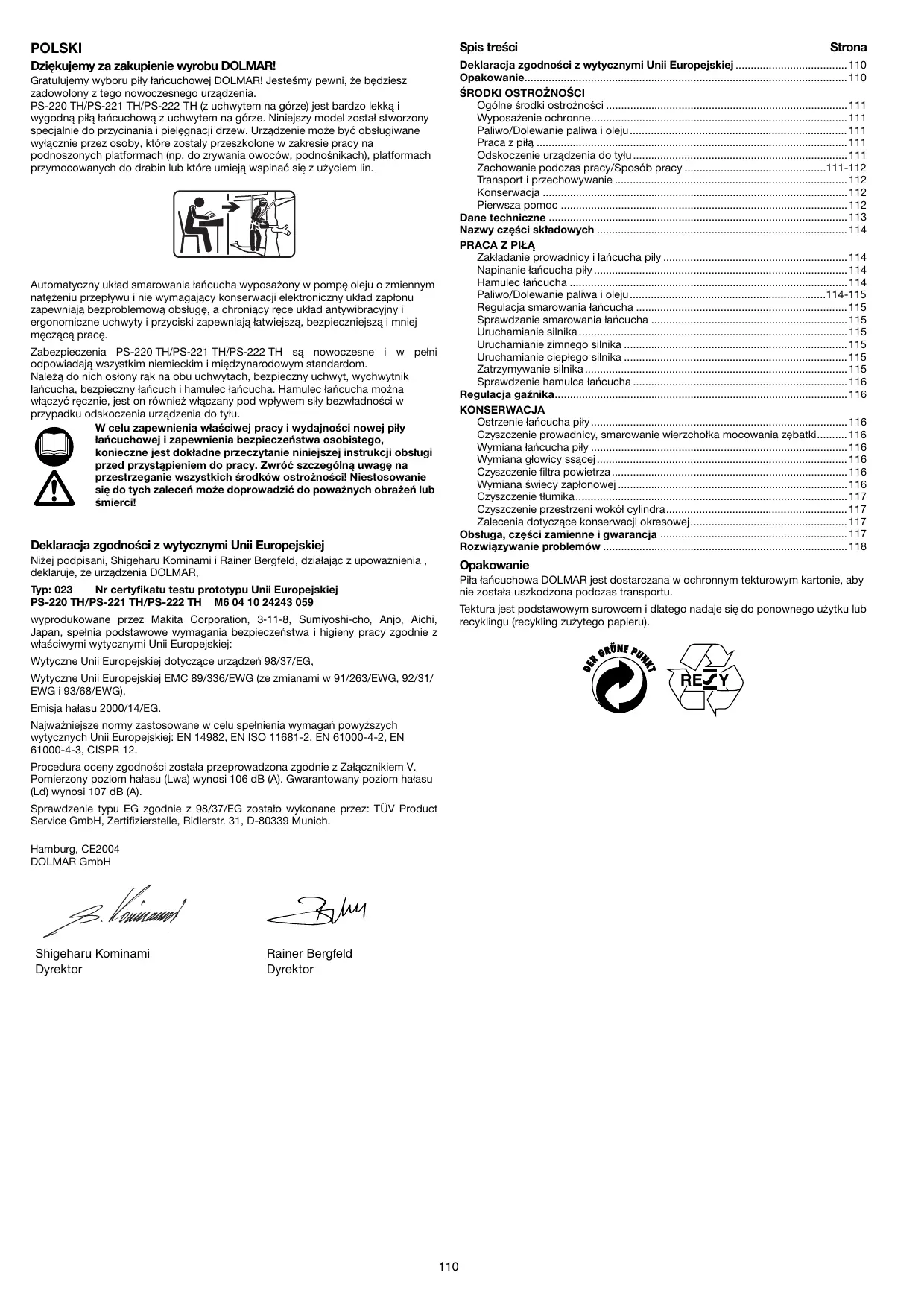 POLSKI Dzigkujemy za zakupienie wyrobu DOLMAR! Gratulujemy wyboru pity tañcuchowej DOLMAR! Jesteémy peuni, ze bedziesz zadowolony z tego nowoczesnego urzadzenia. PS-220 TH/PS-221 TH/PS-222 TH (2 uchwytem na gérze) jest bardzo lekka i wygodna pila lañicuchowa z uchwytem na gérze. Niniejszy model zostal stworzony specjalnie do przycinania i pielegnacii drzew. Urzadzenie moze byé obslugiwane wylacznie przez osoby, ktére zostaly przeszkolone w zakresie pracy na podnoszonych platformach (np. do zrywania owocéw, podnoénikach), platformach przymocowanych do drabin lub ktére umieja wspinaé sie z uyciem lin. Automatyczny uklad smarowania lañcucha wyposaony w pompe oleju 0 zmiennym natezeniu przephyuu i nie wymagajacy konserwacjielektroniczny uklad zaplonu Zapewniaja bezproblemowa obsiuge, a chroniacy rece uklad antywibracyiny i ergonomiczne uchwyty i przyciski zapewmniaja latwiejsza, bezpieczniejsza i mniej meczaca prace Zabezpieczenia PS-220 TH/PS-221 TH/PS-222 TH sa nowoczesne i w. peini odpowiadaja wszystkim niemieckim i miedzynarodowym standardom. Naleza do nich oslony rak na obu uchwytach, bezpieczny uchwyt, wychwytnik taricucha, bezpieczny lañcuch i hamulec larñcucha. Hamulec laficucha moëna wiaczyé recznie, jest on réunie wlaczany pod wplywem sily bezwladnoéci w przypadku odskoczenia urzadzenia do tylu. W celu zapewnienia wlaéciwej pracy i wydainoéci nowej pity O tafñcuchowe) i zapewnienia bezpieczeñstwa osobistego, konieczne jest dokladne przeczytanie niniejszei instrukcji obstugi przed przystapieniem do pracy. Zwréé szczegélna uwage na przestrzeganie wszystkich érodkôw ostroznoéci! Niestosowanie sie do tych zaleceñ moze doprowadzié do powaznych obrazen lub émierci! Deklaracja zgodnoéci z wytycznymi Uni Europejskiej Nizej podpisani, Shigeharu Kominami i Rainer Bergfeld, dziatajac z upowaënienia , deklaruje, 2e urzadzenia DOLMAR, Typ: 023 Nr certyfikatu testu prototypu Unii Europejskie PS-220 TH/PS-221 TH/PS-222 TH M6 04 10 24243 059 wyprodukowane przez Makita Corporation, 3-11-8, Sumiyoshi-cho, Anjo, Aichi, Japan, spelnia podstawowe wymagania bezpieczeñstwa i higieny pracy zgodnie z waéciwymi wytycznymi Uni Europejskiej Wytyczne Unii Europejskiei dotyczace urzadzeñ 98/37/EG, Wytyczne Unii Europejskie EMC 89/336/EWG (ze zmianami w 91/263/EWG, 92/31/ EWG i 93/68/EWG), Emisja halasu 2000/14/EG. Najwainiejsze normy zastosowane w celu spelnienia wymagañ powyszych wytycznych Unii Europejskiej: EN 14982, EN ISO 11681-2, EN 61000-4-2, EN 61000-4-3, CISPR 12. Procedura oceny zgodnoéci zostala przeprowadzona zgodnie z Zalacznikiem V. Pomierzony poziom halasu (Lwa) wynosi 106 dB (A). Gwarantowany poziom hatasu (Ld) wynosi 107 dB (A). Sprawdzenie typu EG zgodnie z 98/37/EG zostalo wykonane przez: Service GmbH, Zertifizierstelle, Ridlerstr. 31, D-80339 Munich. ÜV Product Hamburg, CE2004 DOLMAR GmbH Shigeharu Kominami Dyrektor