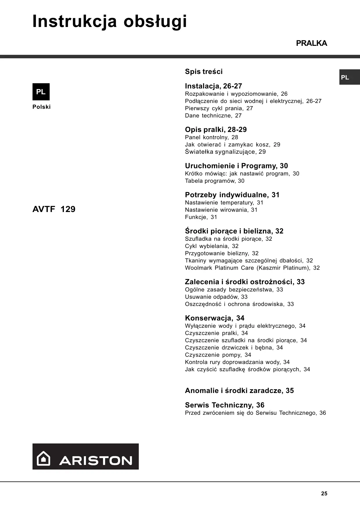 Instalacja, 26-27 Rozpakowanie i wypoziomowanie, 26 Pod³¹czenie do sieci wodnej i elektrycznej, 26-27 Pierwszy cykl prania, 27 Dane techniczne, 27 Opis pralki, 28-29 Panel kontrolny, 28 Jak otwieraæ i zamykac kosz, 29 wiate³ka sygnalizuj¹ce, 29 Uruchomienie i Programy, 30 Krótko mówi¹c: jak nastawiæ program, 30 Tabela programów, 30 Potrzeby indywidualne, 31 AVTF 129 Nastawienie temperatury, 31 Nastawienie wirowania, 31 Funkcje, 31 rodki pior¹ce i bielizna, 32 Szufladka na rodki pior¹ce, 32 Cykl wybielania, 32 Przygotowanie bielizny, 32 Tkaniny wymagaj¹ce szczególnej dba³oci, 32 Woolmark Platinum Care (Kaszmir Platinum), 32 Zalecenia i rodki ostro¿noci, 33 Ogólne zasady bezpieczeñstwa, 33 Usuwanie odpadów, 33 Oszczêdnoæ i ochrona rodowiska, 33 Konserwacja, 34 Wy³¹czenie wody i pr¹du elektrycznego, 34 Czyszczenie pralki, 34 Czyszczenie szufladki na rodki pior¹ce, 34 Czyszczenie drzwiczek i bêbna, 34 Czyszczenie pompy, 34 Kontrola rury doprowadzania wody, 34 Jak czyciæ szufladkê rodków pior¹cych, 34 Anomalie i rodki zaradcze, 35 Serwis Techniczny, 36 Przed zwróceniem siê do Serwisu Technicznego, 36