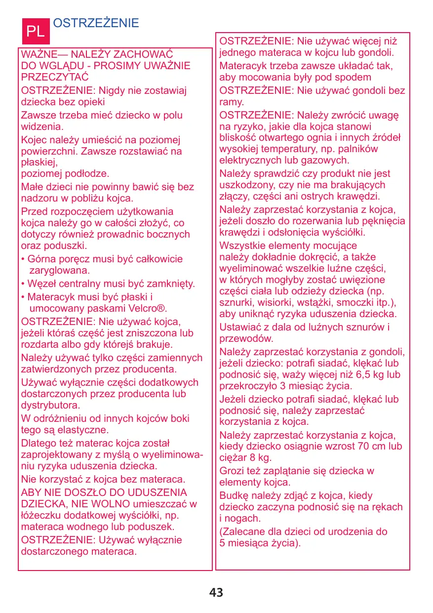 AVERTISSEMENT: Ne pas utiliser plus d’un matelas à la fois dans le berceau ou dans le rehausseur de matelas. Toujours utiliser le matelas sommier fourni, en le fixant avec les sangles situées en dessous. AVERTISSEMENT: Ne pas utiliser le rehausseur de matelas hors du berceau AVERTISSEMENT: Attention aux accidents liés aux flammes et autres sources de forte chaleur telles que radiateurs électriques, ou radiateurs à gaz, dans le voisinage du berceau. Vérifier le berceau pour détecter les parties abimées ou manquantes, et les bords acérés. Si les bords rembourrés sont déchirés et donnent un accès au rembourrage il faut arrêter d’utiliser le berceau. Tous les dispositifs de fixation doivent être correctement attachés. Faire attention à ce que le bébé n’ait pas une partie de son corps ou de ses vêtements (rubans, colliers) coincés, entrainant un risque d’étranglement. Mettre le berceau loin des cordons de téléphones ou de fils électriques. Arrêtez d’utiliser le rehausseur de matelas lorsque l’enfant vérifie une des conditions suivantes: l’enfant peut s’asseoir, se mettre à genoux ou se redresser tout seul, ou, à partir du moment où il pèse plus de 6,5 kg ou a plus de 3 mois. Lorsqu’un enfant est capable de s’asseoir, ou de se mettre à genoux, ou de se redresser tout seul, le berceau ne doit plus être utilisé pour cet enfant. Arrêtez d’utiliser le berceau lorsque l’enfant mesure 70 cm ou pèse plus de 8kg.