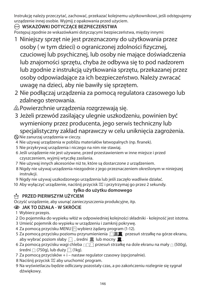 C JAK TO DZIAŁA - W SKRÓCIE 1 Wybierz przepis. 2 Do pojemnika do wypieku włóż w odpowiedniej kolejności składniki - kolejność jest istotna. 3 Umieść pojemnik do wypieku w urządzeniu i zamknij pokrywę. 4 Za pomocą przycisku MENU Z wybierz żądany program (1-12). 5 Za pomocą przycisku poziomu przyrumienienia ghh przesuń strzałkę na górze ekranu, aby wybrać poziom słaby g , średni h lub mocny h . 6 Za pomocą przycisku wagi chleba FGH przesuń strzałkę na dole ekranu na mały F (500g), średni G (750g), lub duży H (1kg). 7 Za pomocą przycisków + i – nastaw regulator czasowy (opcjonalnie). 8 Naciśnij przycisk I aby uruchomić program. 9 Na wyświetlaczu będzie odliczany pozostały czas, a po zakończeniu rozlegnie się sygnał dźwiękowy. 146