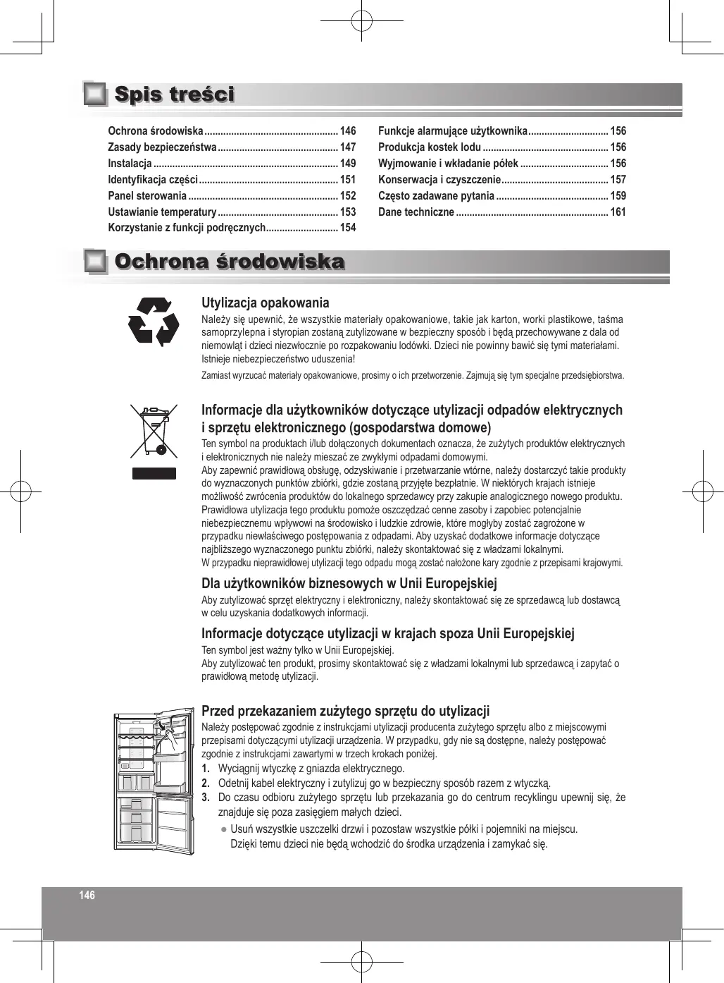 Spis treści Ochrona środowiska 146 Zasady bezpieczeństwa 147 Instalacja 149 Identyfikacja części 151 Panel sterowania 152 Ustawianie temperatury 153 Korzystanie z funkcji podręcznych 154