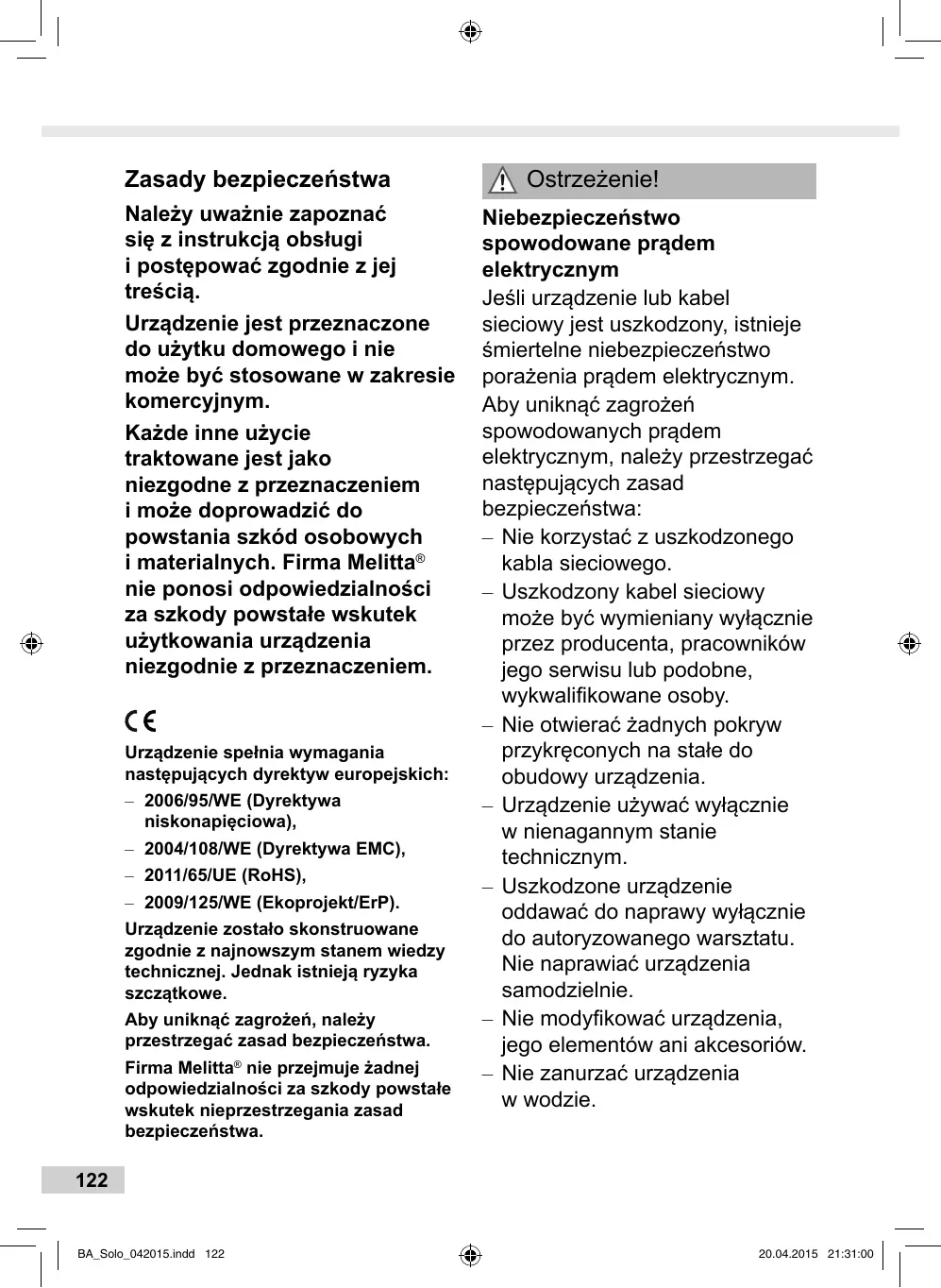 Zasady bezpieczeństwa Należy uważnie zapoznać się z instrukcją obsługi i postępować zgodnie z jej treścią. Urządzenie jest przeznaczone do użytku domowego i nie może być stosowane w zakresie komercyjnym. Każde inne użycie traktowane jest jako niezgodne z przeznaczeniem i może doprowadzić do powstania szkód osobowych i materialnych. Firma Melitta® nie ponosi odpowiedzialności za szkody powstałe wskutek użytkowania urządzenia niezgodnie z przeznaczeniem. Urządzenie spełnia wymagania następujących dyrektyw europejskich: – 2006/95/WE (Dyrektywa niskonapięciowa), – 2004/108/WE (Dyrektywa EMC), – 2011/65/UE (RoHS), – 2009/125/WE (Ekoprojekt/ErP). Urządzenie zostało skonstruowane zgodnie z najnowszym stanem wiedzy technicznej. Jednak istnieją ryzyka szczątkowe. Aby uniknąć zagrożeń, należy przestrzegać zasad bezpieczeństwa. Firma Melitta® nie przejmuje żadnej odpowiedzialności za szkody powstałe wskutek nieprzestrzegania zasad bezpieczeństwa. Ostrzeżenie! Niebezpieczeństwo spowodowane prądem elektrycznym Jeśli urządzenie lub kabel sieciowy jest uszkodzony, istnieje śmiertelne niebezpieczeństwo porażenia prądem elektrycznym. Aby uniknąć zagrożeń spowodowanych prądem elektrycznym, należy przestrzegać następujących zasad bezpieczeństwa: – Nie korzystać z uszkodzonego kabla sieciowego. – Uszkodzony kabel sieciowy może być wymieniany wyłącznie przez producenta, pracowników jego serwisu lub podobne, wykwalifikowane osoby. – Nie otwierać żadnych pokryw przykręconych na stałe do obudowy urządzenia. – Urządzenie używać wyłącznie w nienagannym stanie technicznym. – Uszkodzone urządzenie oddawać do naprawy wyłącznie do autoryzowanego warsztatu. Nie naprawiać urządzenia samodzielnie. – Nie modyfikować urządzenia, jego elementów ani akcesoriów. – Nie zanurzać urządzenia w wodzie.