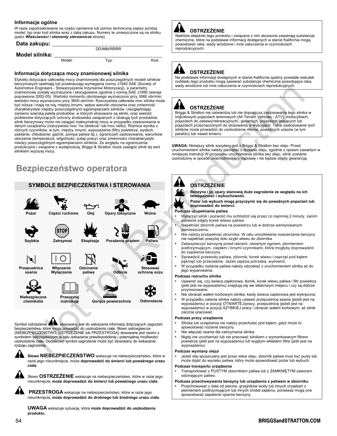 À OSTRZEZENIE Niektôre skladniki tego produktu i zwiazane z nim akcesoria zawieraja substancje chemiczne, ktôre na podstawie informacji dostepnych w stanie Kalifornia moga powodowaé raka, wady wrodzone i inne zaburzenia w czynnoéciach reprodukcyinych. À OSTRZEZENIE Na podstawie informacji dostepnych w stanie Kalifornia spaliny powstale wskutek rozkladu tego produktu moga zawieraé substancje chemiczne powodujace raka, wady wrodzone lub inne zaburzenia w czynnoéciach reprodukcyjnych. À OSTRZEZENIE Briggs & Stratton nie zatwierdza lub nie dopuszcza zastosowania tego silnika w téjkolowych pojazdach terenowych (All Terrain Vehicles - ATV), motocyklach, pojazdach do zabawy/rekreacyinych/, gokartach, pojazdach latajacych lub pojazdach przeznaczonych do stosowania w wyécigach. Takie zastosowanie tych Silnikéw moze prowadzié do uszkodzenia mienia, powaznych urazéw (w tym paralizu) lub nawet $mierci. UWAGA: Niniejszy silnik wysylany jest z Briggs & Stratton bez oleju. Przed uruchomieniem silnika nalezy pamigtaé o dodaniu oleju, zgodnie z opisem zawartym w niniejszei instrukcji W przypadku uruchomienia silnika bez oleju, silnik zostanie uszkodzony w sposéb uniemozliwiajacy naprawe i nie bedzie objety gwarancja, OSTRZEZENIE Benzyna i jej opary stanowia duie zagroienie ze wzgledu na ich tatwopalnogé i wybuchowoéé. Pozar lub wybuch moga przyczynié sie do powaänych poparzeñ lub doprowadzié do émierci. Podezas uzupelniania paliwa + Wylaczyé silnik pozwolié mu ochlodzié sie przez co najmniej 2 minuty, zanim zostanie zdjety korek wlewu paliwa. + Napelniaé zbiornik paliwa na powietrzu lub w dobrze wentylowanym pomieszczeniu + Nie nalezy przepelniaé zbiornika. W celu umozliwienia rozszerzania benzyny nie napelniaé powyzej dolu szyjki wlewu do zbiornika. + Zabezpieczyé benzyne przed iskrami, otwartym ogniem, plomieniem podtrzymujacym, cieplem i innymi czynnikami, ktôre mogiyby doprowadzié do zapalenia benzyny. + Sprawdzié przewodÿy paliwa, zbiornik, korek wlewu i osprzet pod katem peknieé lub przeciekôw. JeZeli zajdzie potrzeba, wymienié. + W przypadku rozlania paliwa nale2y odezekaé z uruchomieniem silnika az do iego wyparowania: Podezas rozruchu silnika + Upewnié sig, czy éwieca zaplonowa, tumik, korek wlewu paliwa i filtr powietrza el jest na wyposazeniu) znajduja sie we wlaéciwym miejscu i czy sa dobrze przymocowane. + Nie obracaé walem korbowym silnika, kiedy éwieca zaplonowa jest wykrecona. + W przypadku zalania silnika nale2y ustawié przepustnice ssania (jezeli jest na wyposazeniu) w pozycii OTWARTEJ/pracy, przepustnice (je2elijest na wyposazeniu) w pozycii SZYBKIEJ pracy i obracaé walem korbowym, az silnik zacznie pracowaé. Podczan pracy urendeenta Silnika lub urzadzenia nie nale2y przechylaé pod katem, gdyz moze to spowodowaé rozlanie benzyny. + Nie wlaczaé ssania dla zatrzymania silnika. + Nigdy nie uruchamiaé lub nie pracowaé silnikiem z wymontowanym filtrem powietrza (jeéli jest na wyposazeniu) lub wyjetym wkladem filtra (jesli jest na wyposazeniu). Podezas wymiany olejul + Jeeli olej spuszczany jest przez wlew oleju, zbiomik paliwa musi byé pusty lb moe dojéé do wycieku paliwa, ktéry moze spowodowaé pozar lub wybuch. Podezas transportu urzadzenia + Transportowaé z PUSTYM zbiomikiem paliwa lub z ZAMKNIETYM zaworem odcinajacym paliwo. Podezas przechowywania benzyny lub urzadzenia z paliwem w zbiorniku + Przechowywaé z dala od piecôw, grzejnikéw wody lub innych urzadzeñ z plomieniem podtrzymujacym lub innych Zrédel zaplonu, poniewaz moga one spowodowaé zapalenie oparéw benzyny. BRIGGSandSTRATTON.COM