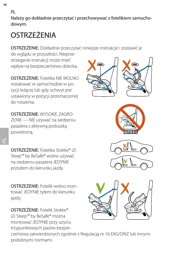 OSTRZEŻENIE: Dziecko należy zawsze zabezpieczać pasami dostarczonymi z fotelikiem Stokke® iZi Sleep™ by BeSafe®. OSTRZEŻENIE: Aby uniknąć niezamierzonego przemieszczenia się dziecka lub fotelika Stokke® iZi Sleep™ by BeSafe®, należy pamiętać o mocnym zaciśnięciu zarówno trzypunktowych pasów bezpieczeństwa, jak i pasa bezpieczeństwa dziecka. Regularnie sprawdzać. OSTRZEŻENIE: Wszyscy pasażerowie powinni zapiąć pasy bezpieczeństwa. OSTRZEŻENIE: Fotelik Stokke® iZi Sleep™ by BeSafe® umieszczać bezpośrednio na siedzeniu pasażera. NIE UŻYWAĆ żadnych elementów, takich jak poduszka czy płaszcz do podwyższenia fotelika samochodowego na siedzeniu pasażera.