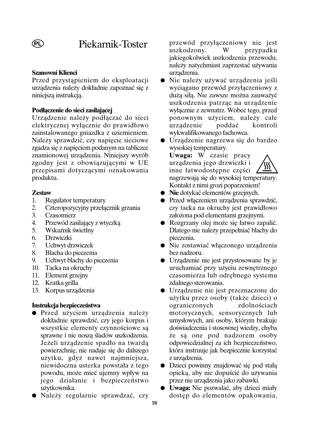 Uwaga: W czasie pracy urzadzenia loro drzwiczki i innate latwodostepne czeci nagrzewaja sie do wysokiej ten Kontakt z nimi grozi poparzenie